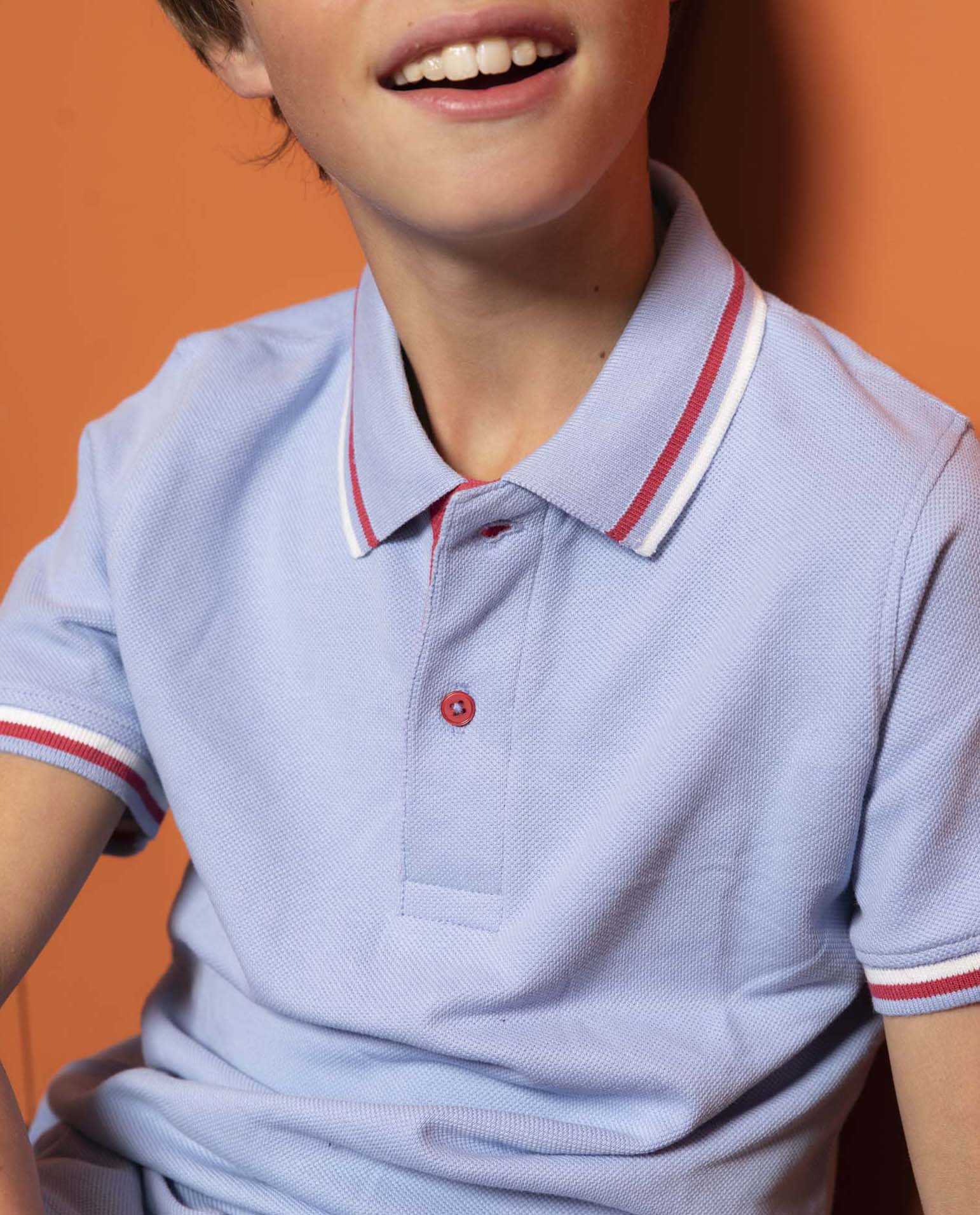 Polo garçon. Manches courtes. Col polo en côtes, rayures contrastées au col et au bas de la manche. Empiècement à l'intérieur sous l'encolure en popeline rayée. Fentes aux côtés. Maille piquée pur coton.