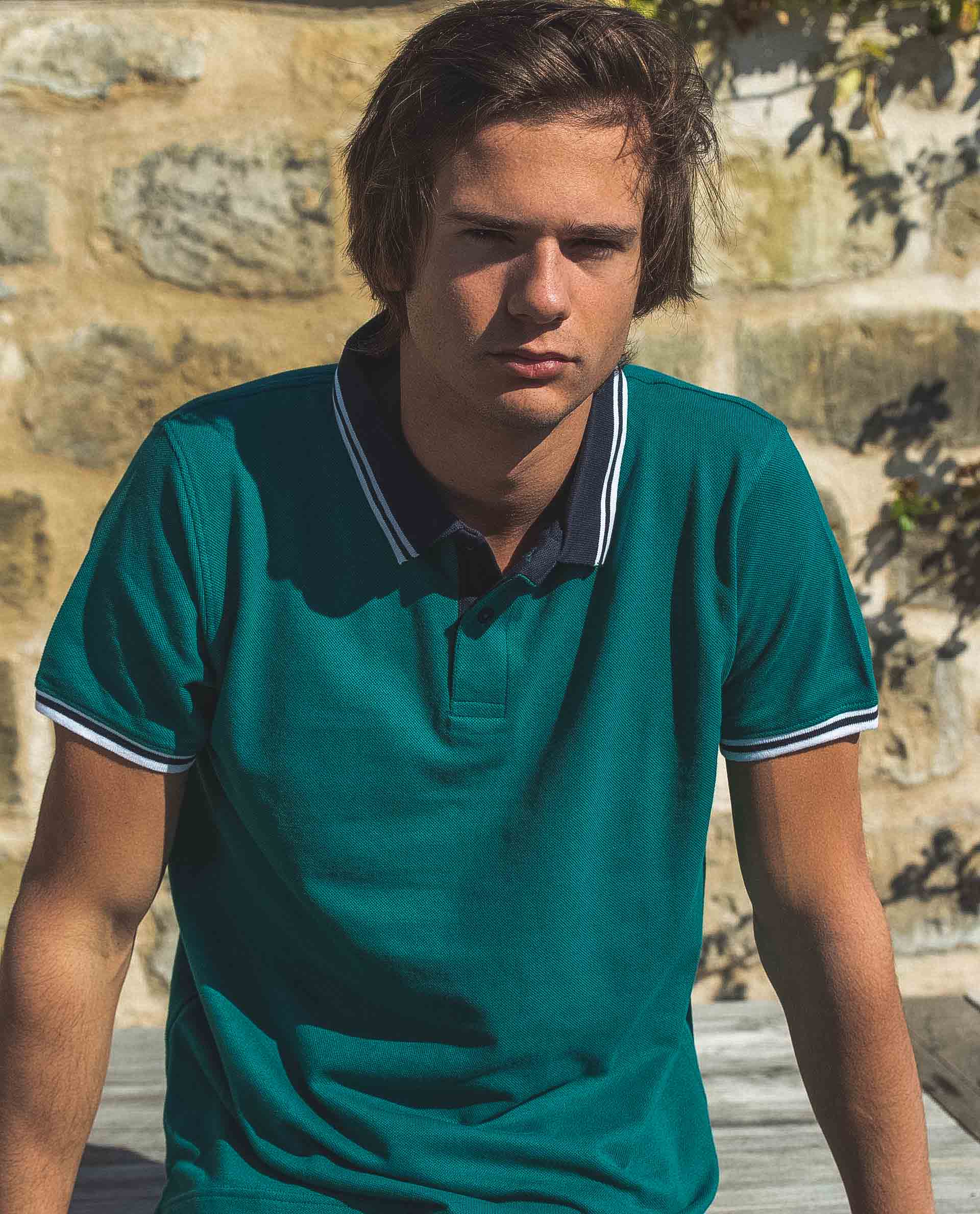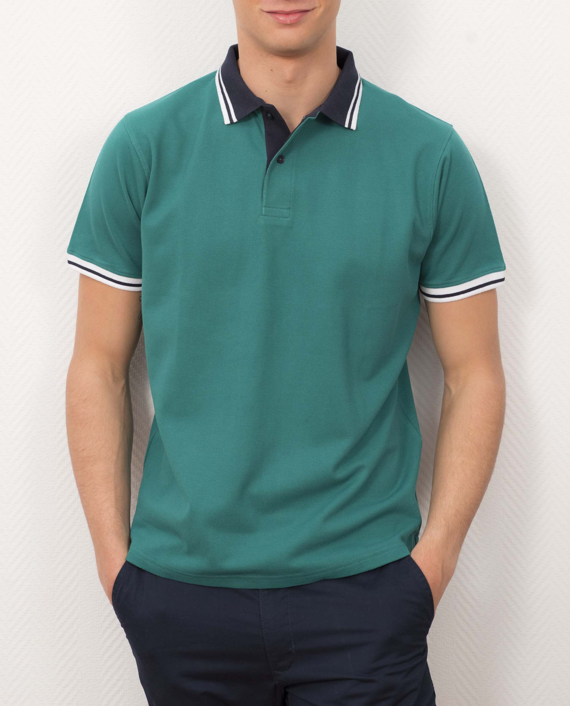 Polo homme. Manches courtes. Col polo en côtes, rayure contrastée au col et au bas de la manche. Empiècement à l'intérieur sous l'encolure en popeline rayée. Fentes aux côtés. Maille piquée pur coton. Le mannequin mesure 1m92 et porte une taille XL.
