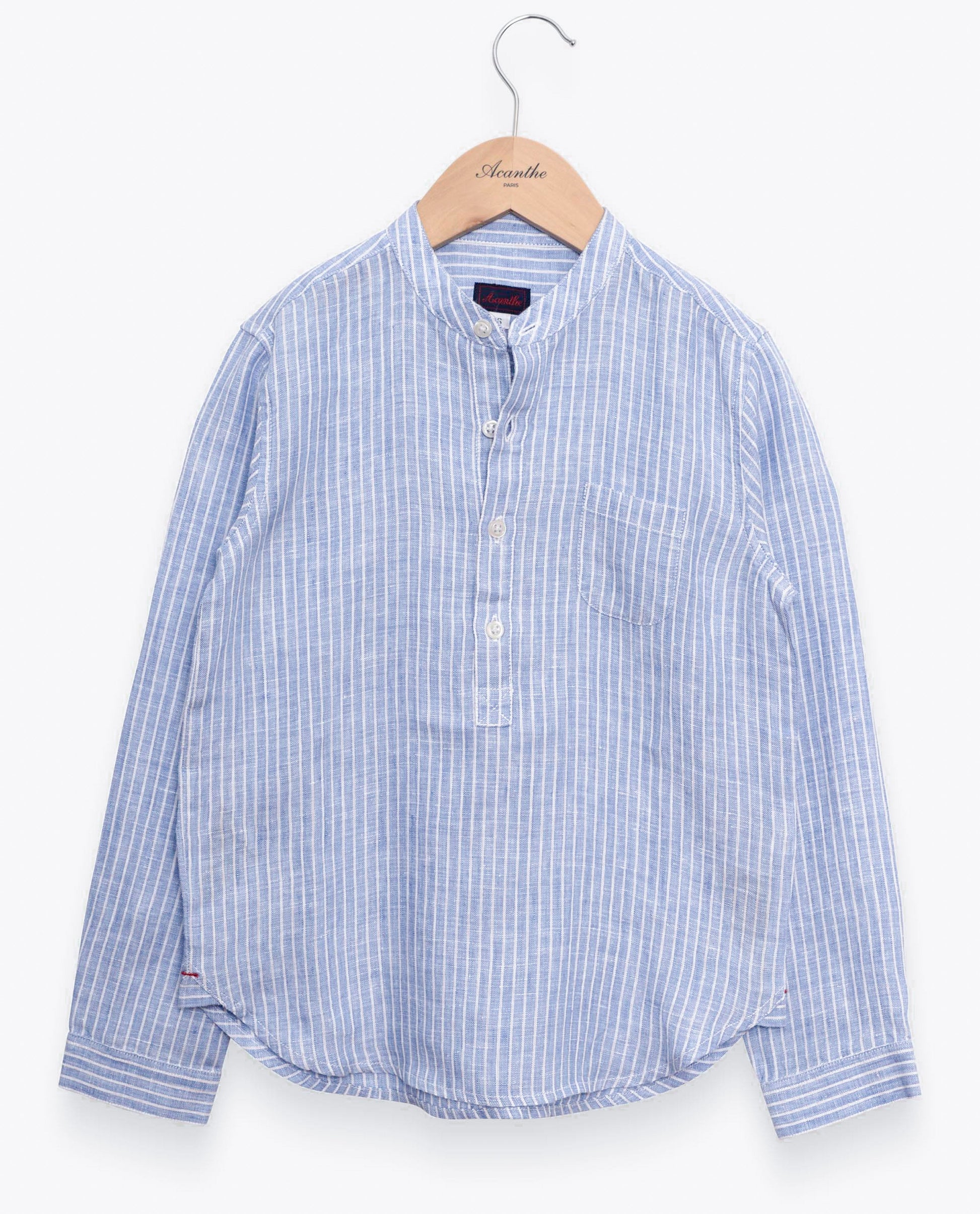Chemise en lin rayé col mao. Manches longues. Pans arrondis au bas.
