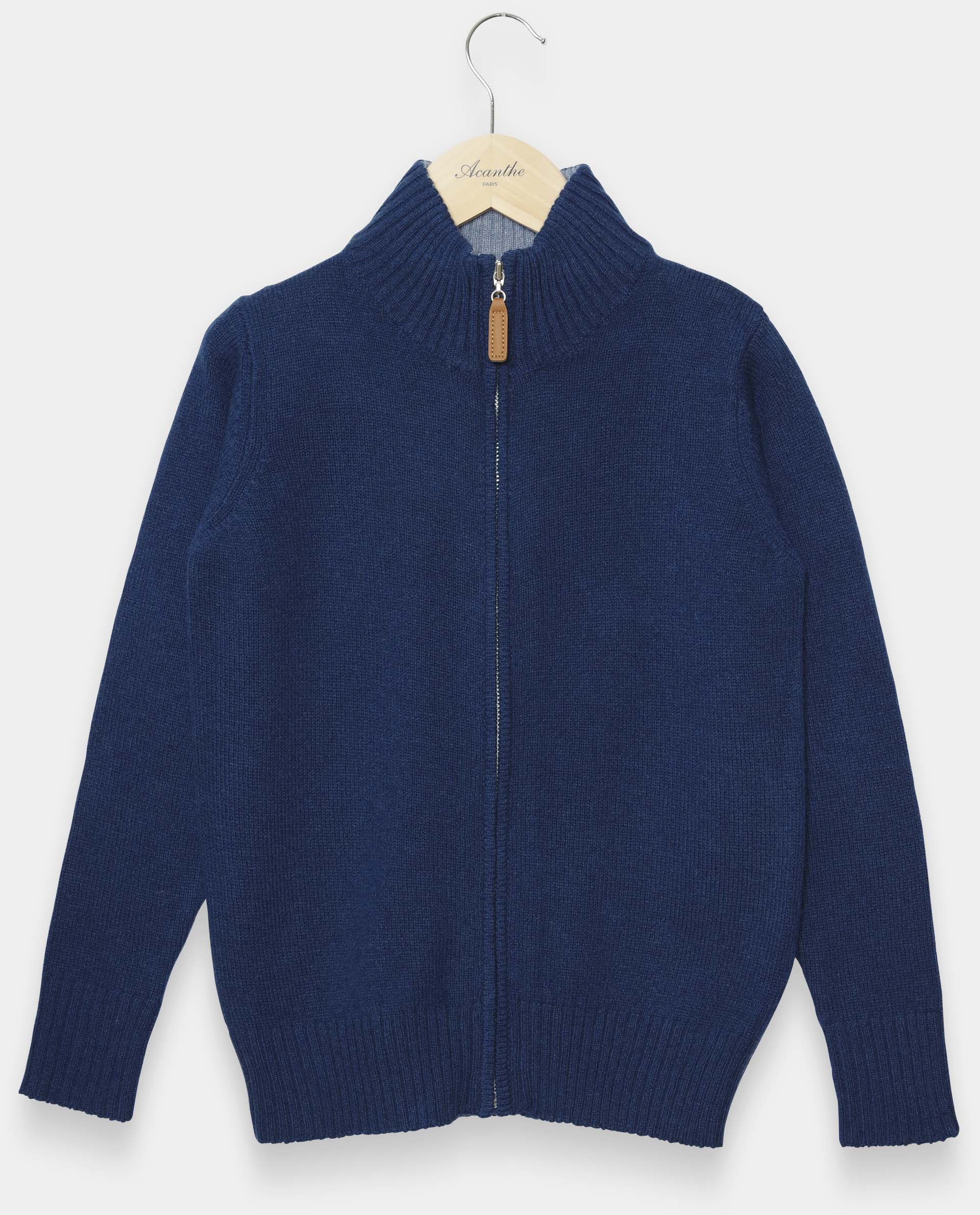 Cardigan zippé en jersey. Finitions bord-côtes. Intérieur col contrasté. Pure laine d'agneau.