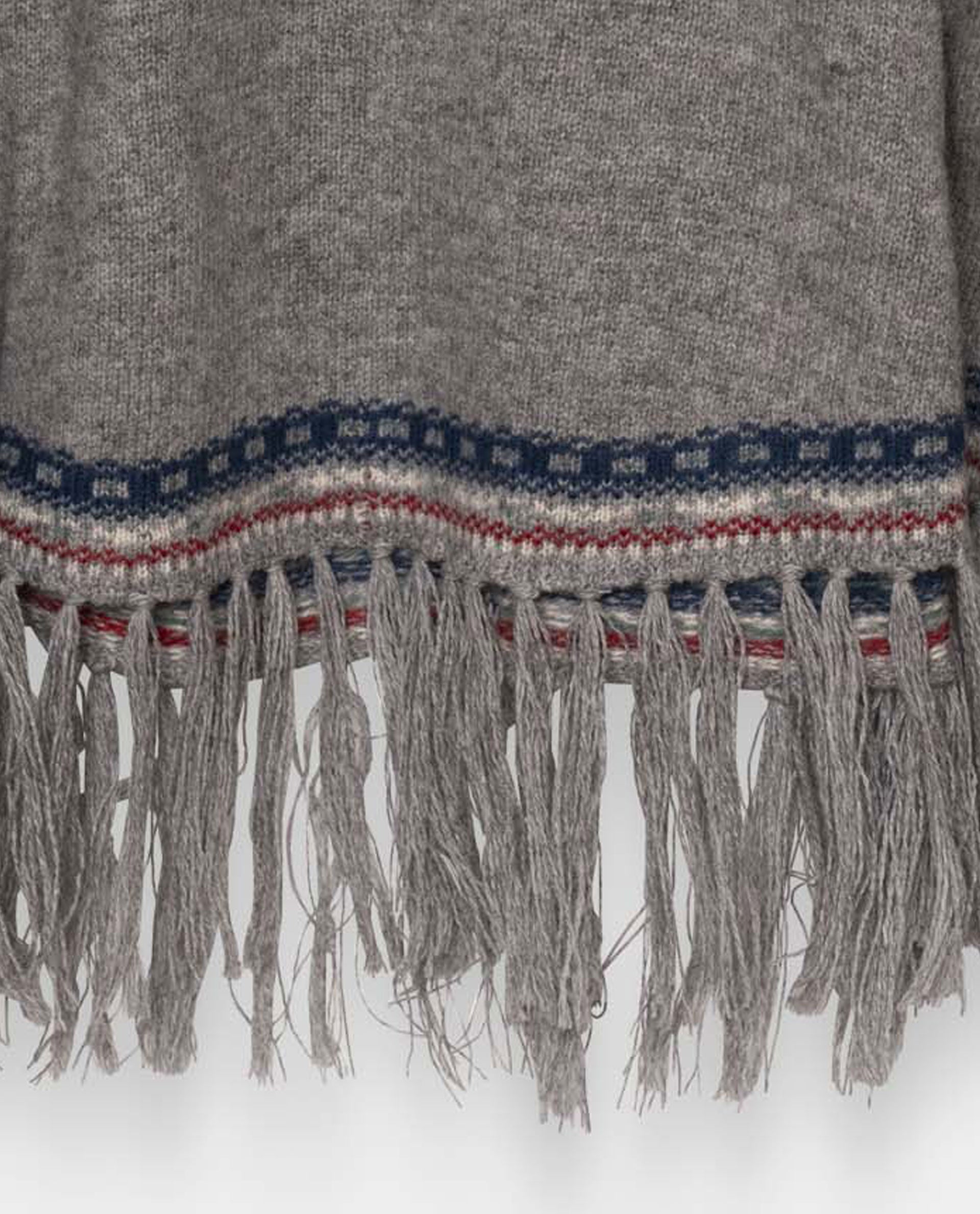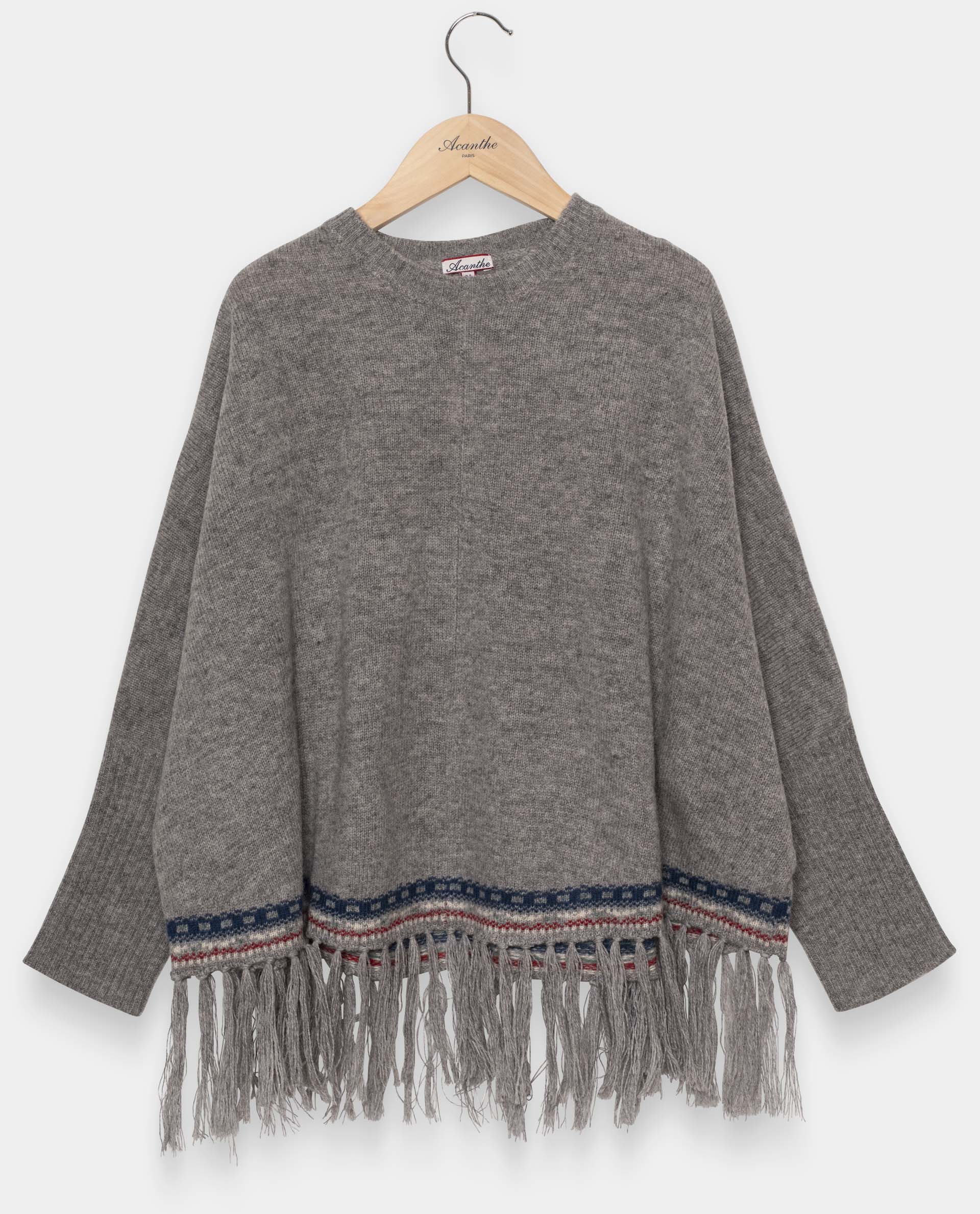 Maille jersey, encolure ronde finie par un bord-côtes, franges au bas. Pure laine d'agneau.