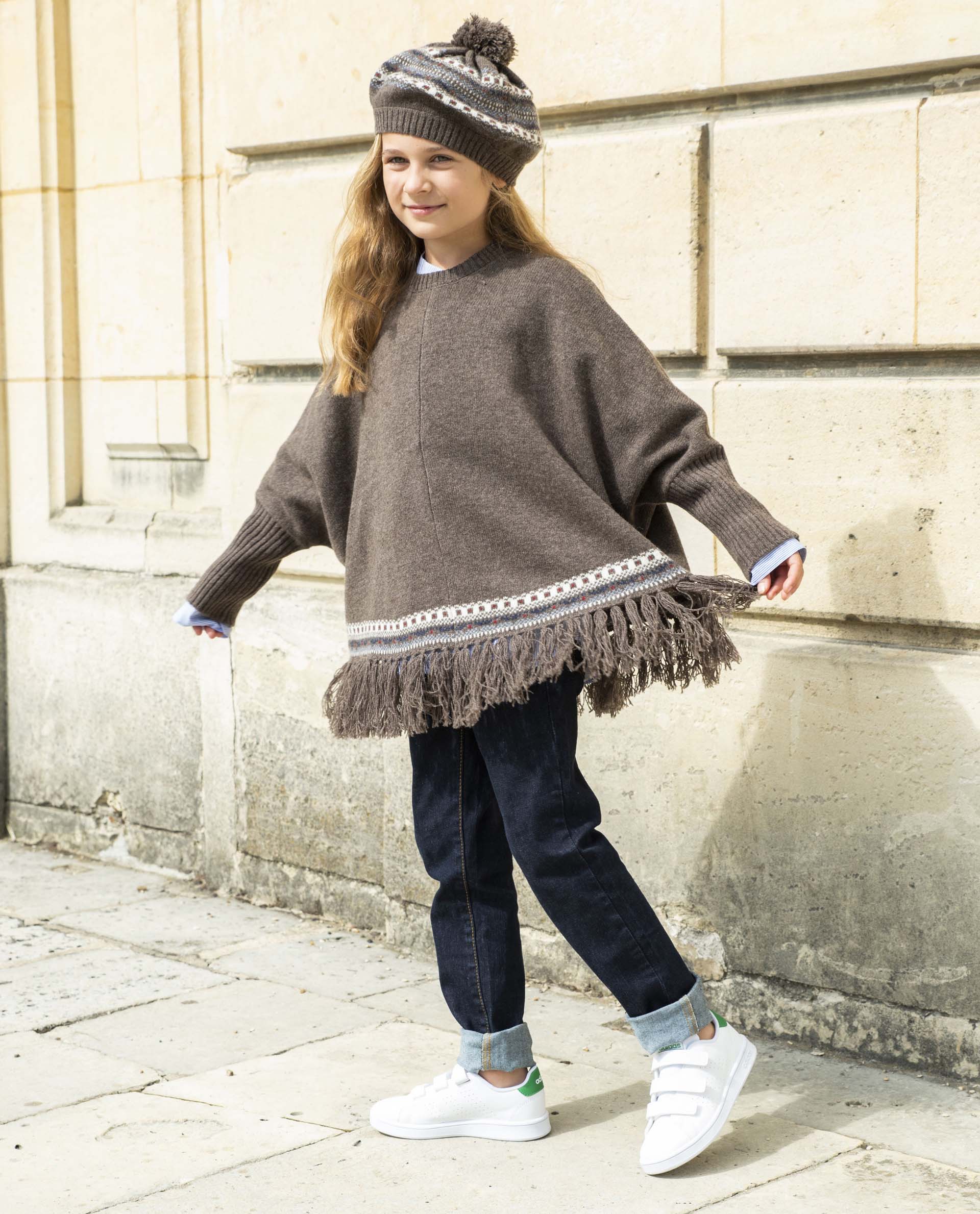 Maille jersey, encolure ronde finie par un bord-côtes, franges au bas. Pure laine d'agneau.