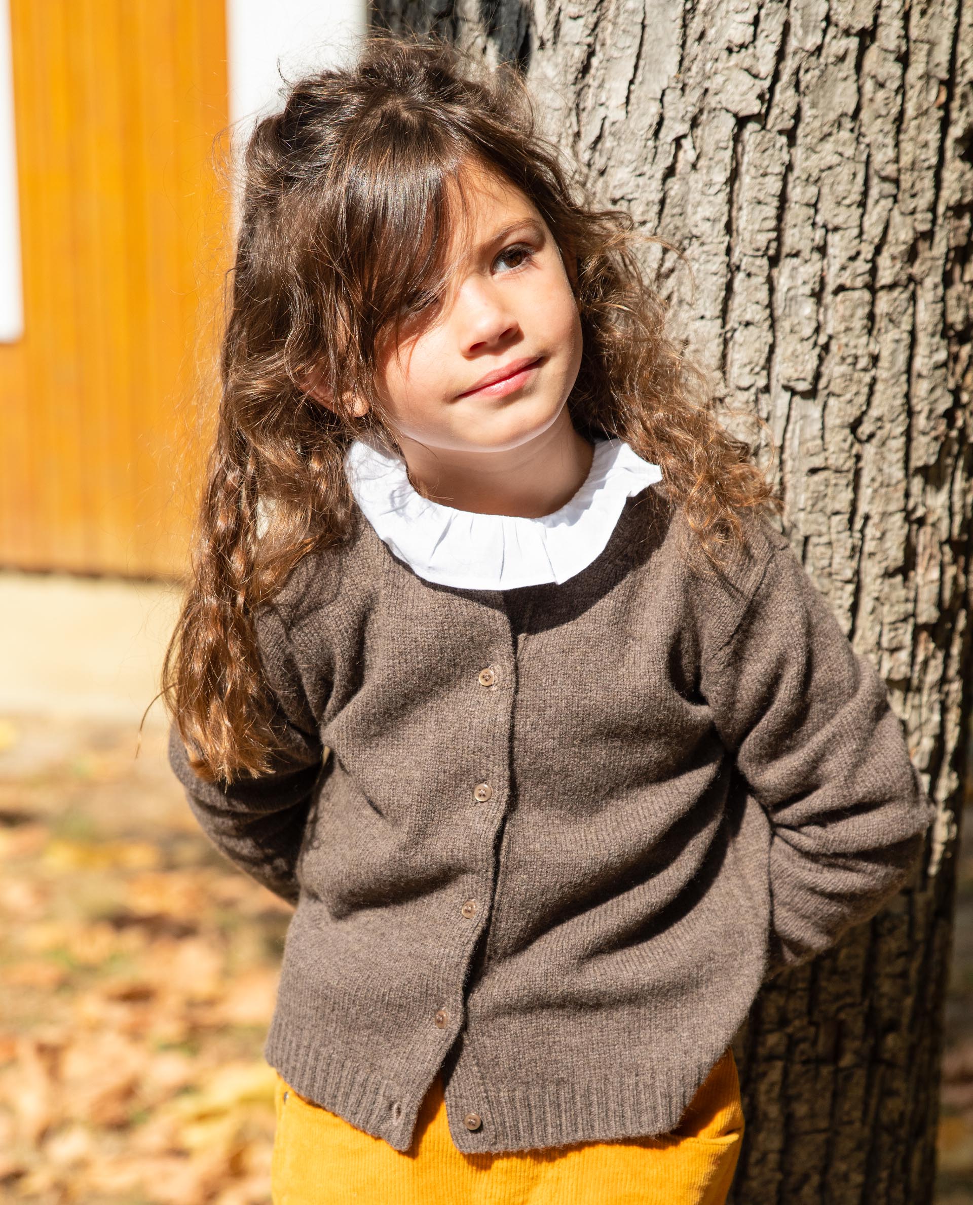 T-shirt col rond orné d'un petit volant en voile de coton blanc au col et au bas des manches longues. Boutonné au dos. Maille jersey coton.