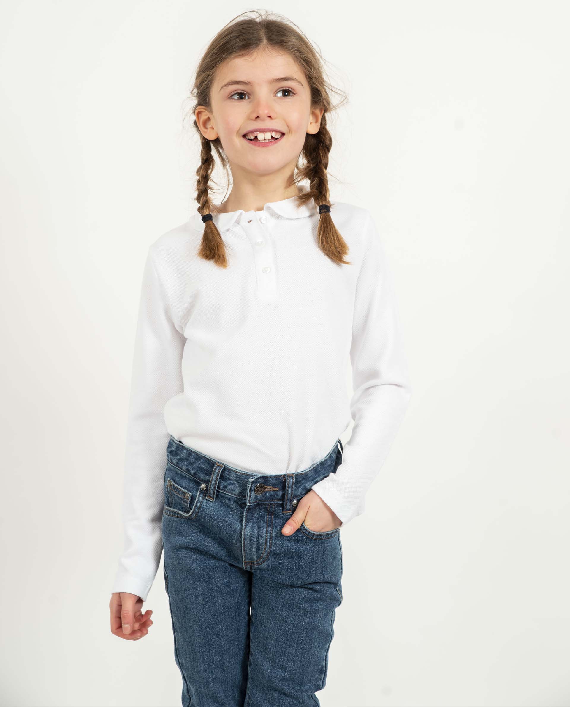 Petit col claudine. Manches longues. Patte de boutonnage avec boutons en nacre. Maille piquée.