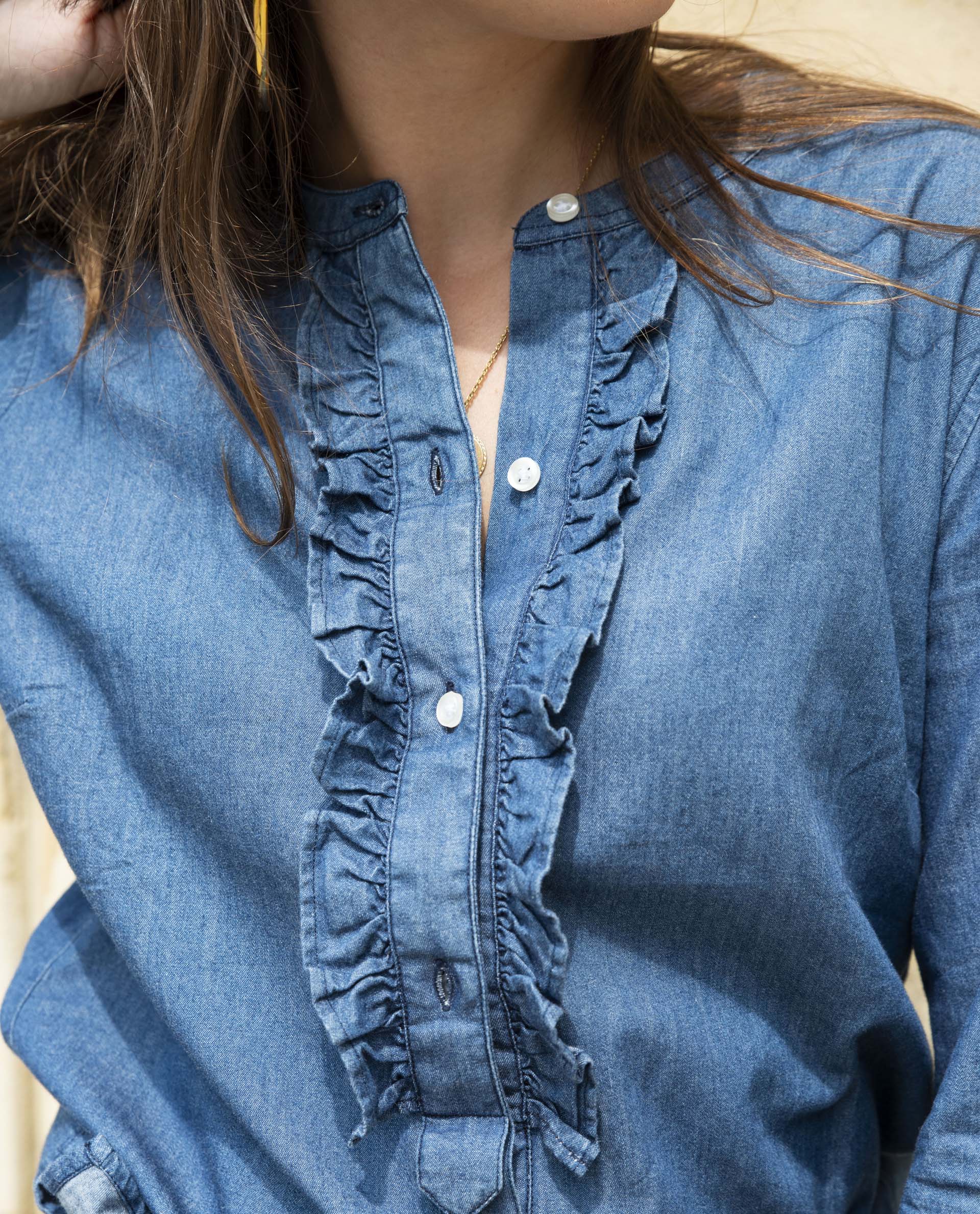 Chemisier manches longues. Encolure ras du cou. Volant de chaque côté de la patte de boutonnage.