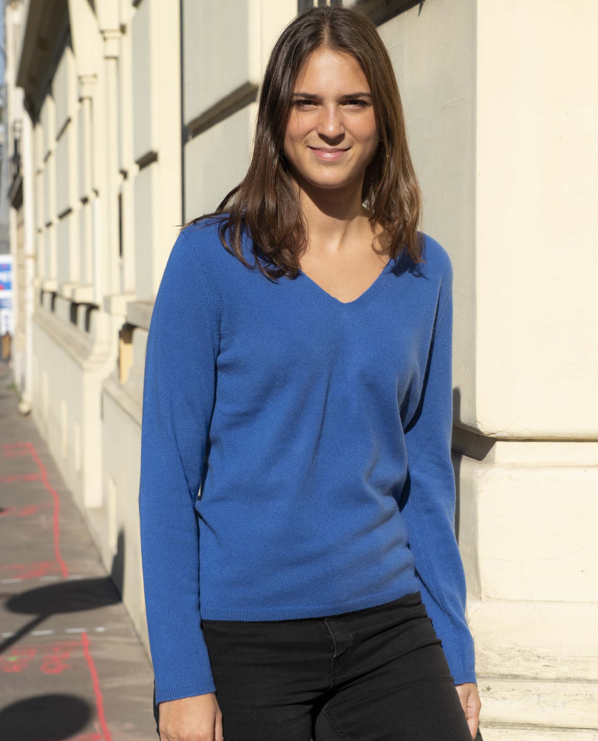 Pull V manches longues près du corps en cachemire double fil. Encolure bord franc. Finition bord côtes.