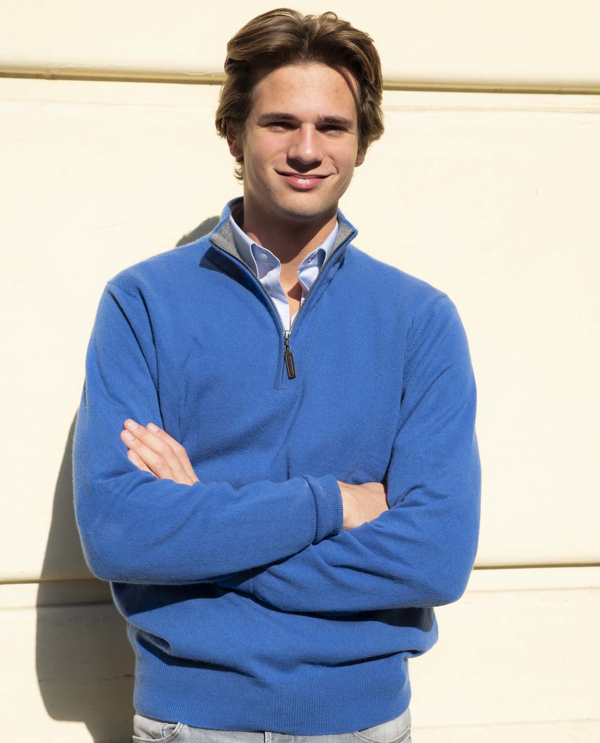 Pull maille jersey en cachemire double fil. Col zippé avec intérieur contrasté. Finition bord côtes.