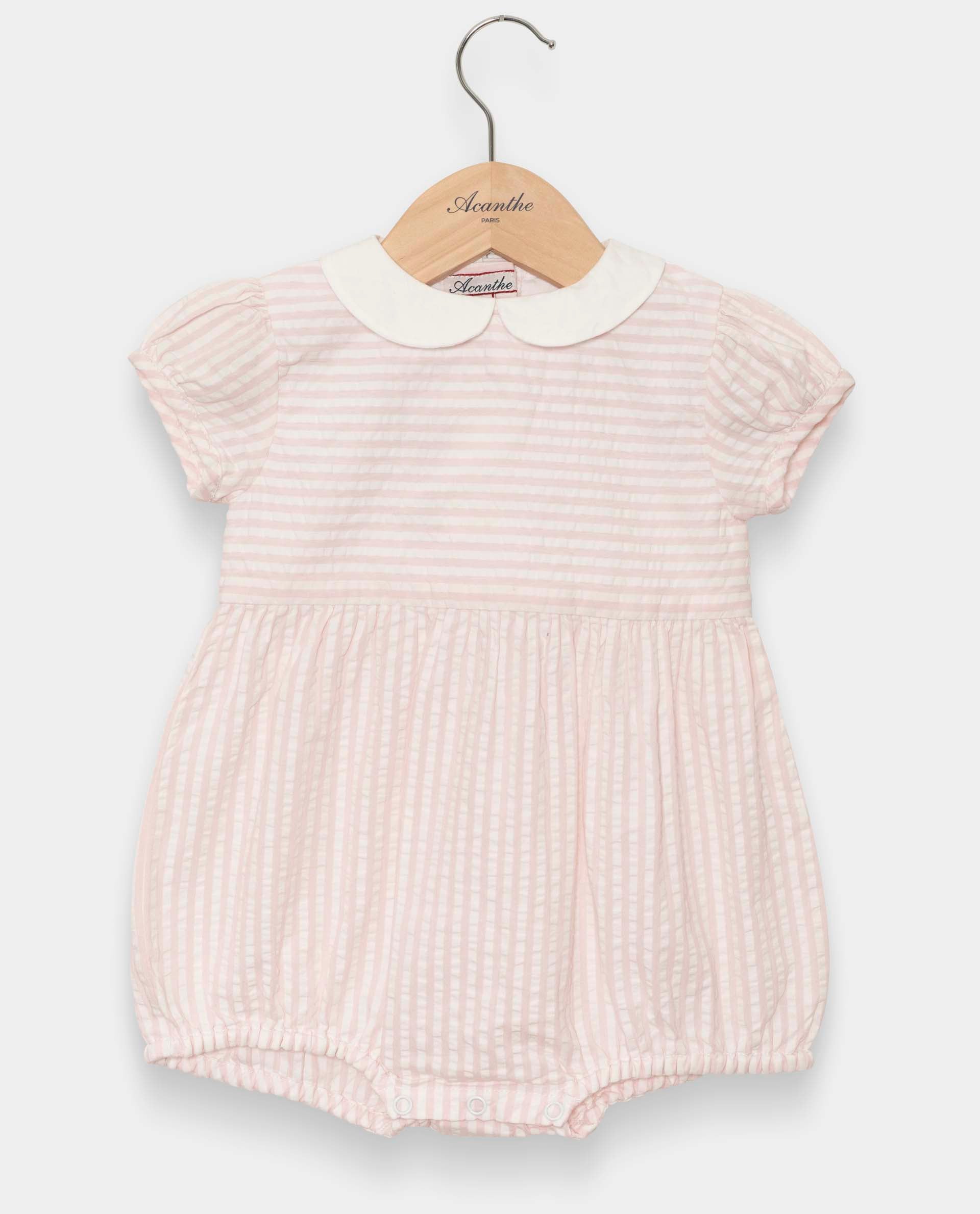 barboteuse col rond manches ballon seersucker rayure rose