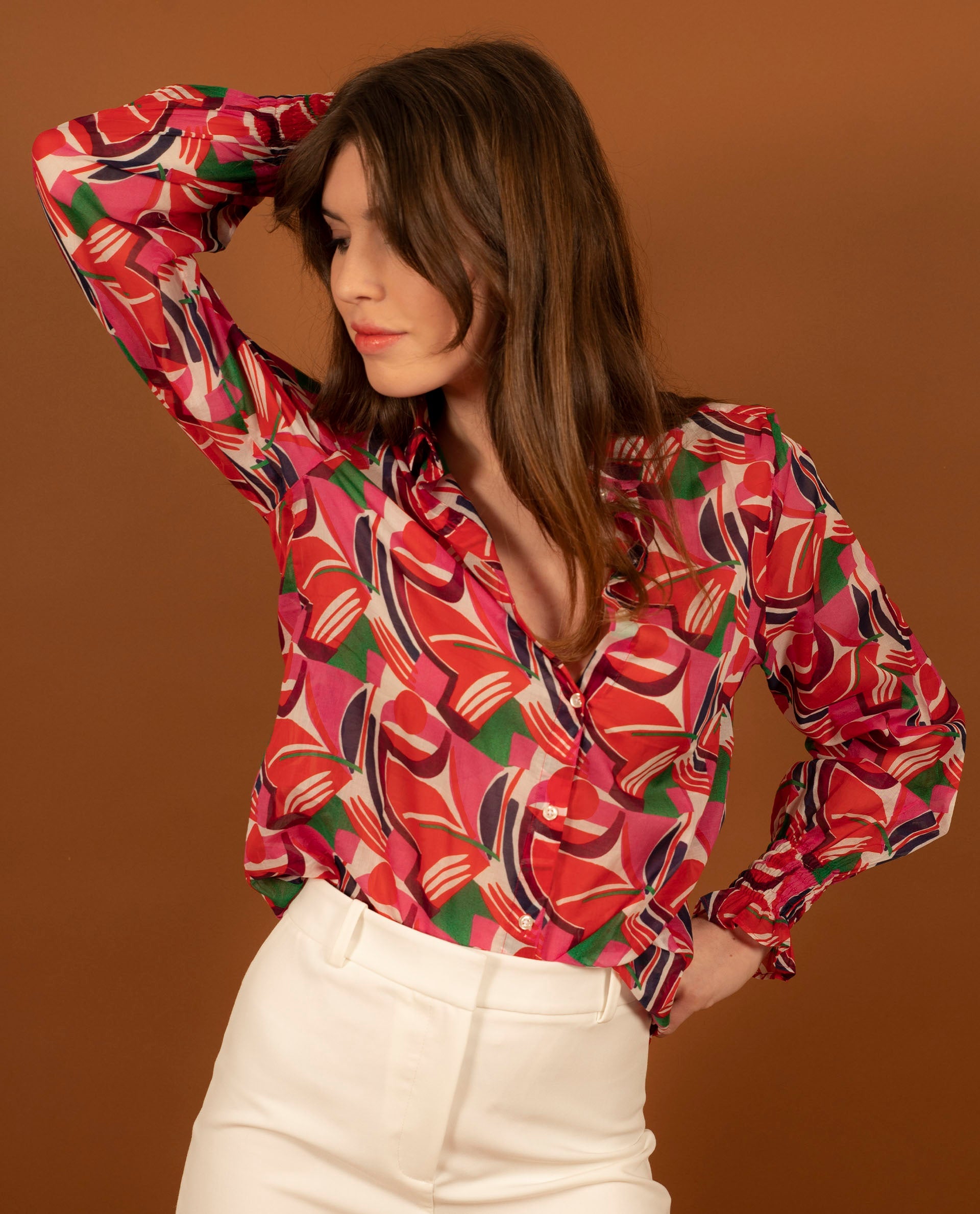 Blouse col rond manches longues larges et bouffantes. Poignets smocké