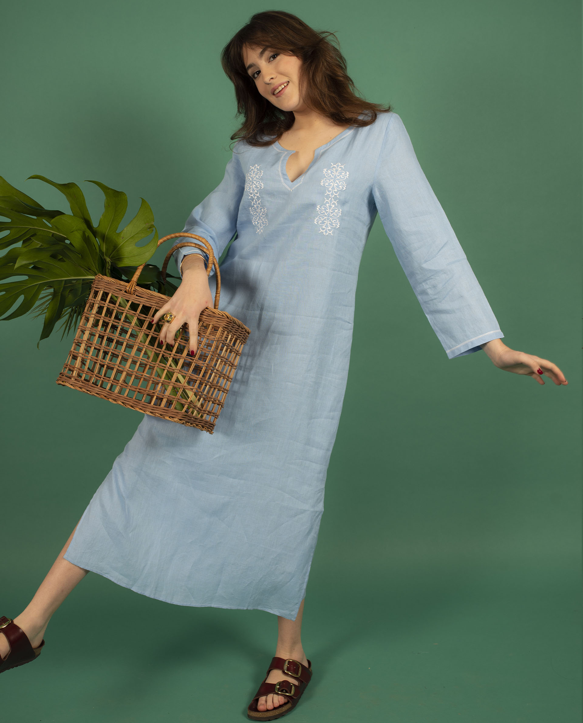 Robe longue manches longues. Encolure tunisienne. Grosses broderies de chaque cô
