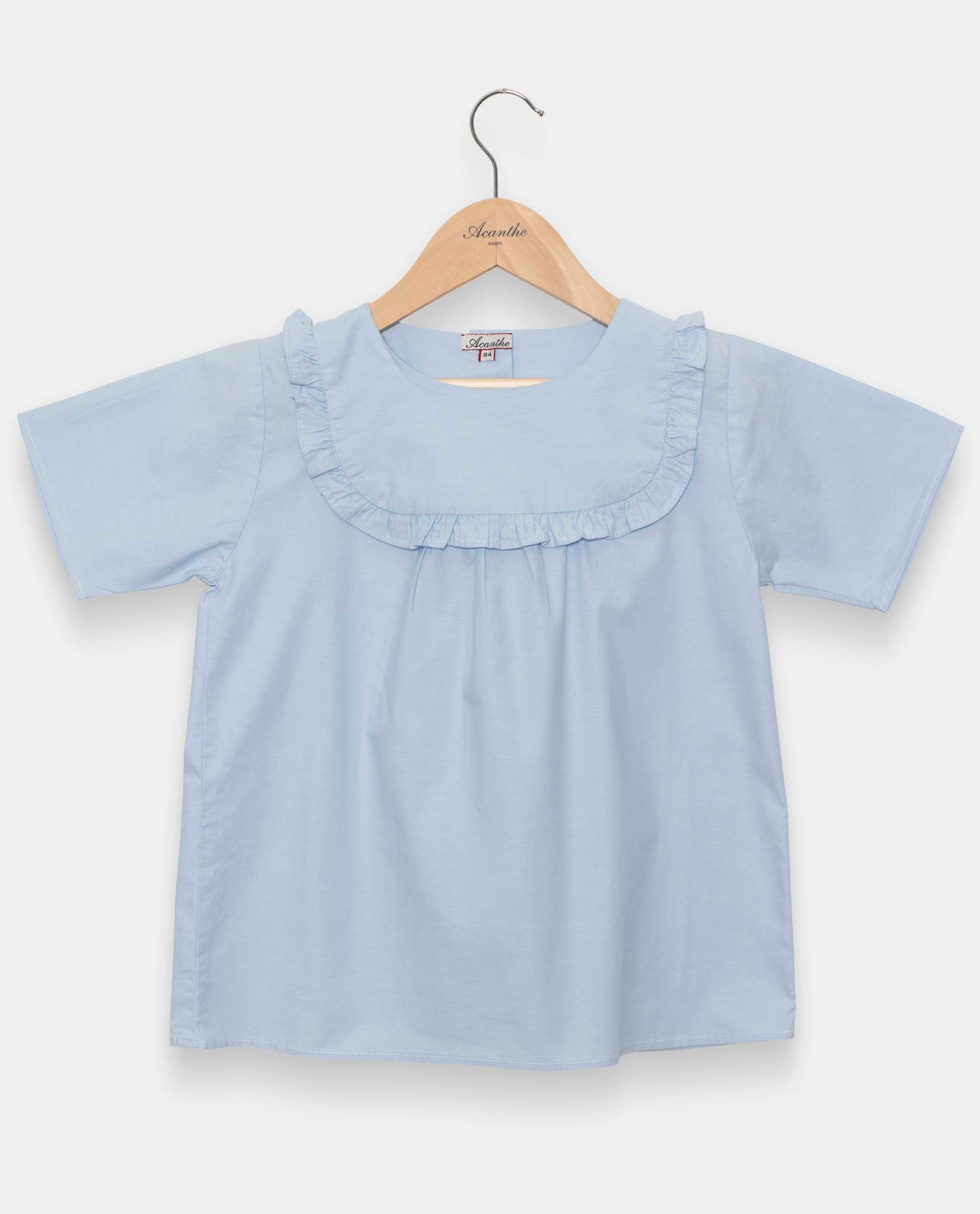 Encolure ronde. Plastron arrondi en haut devant et dos. Volant simple autour du plastron.