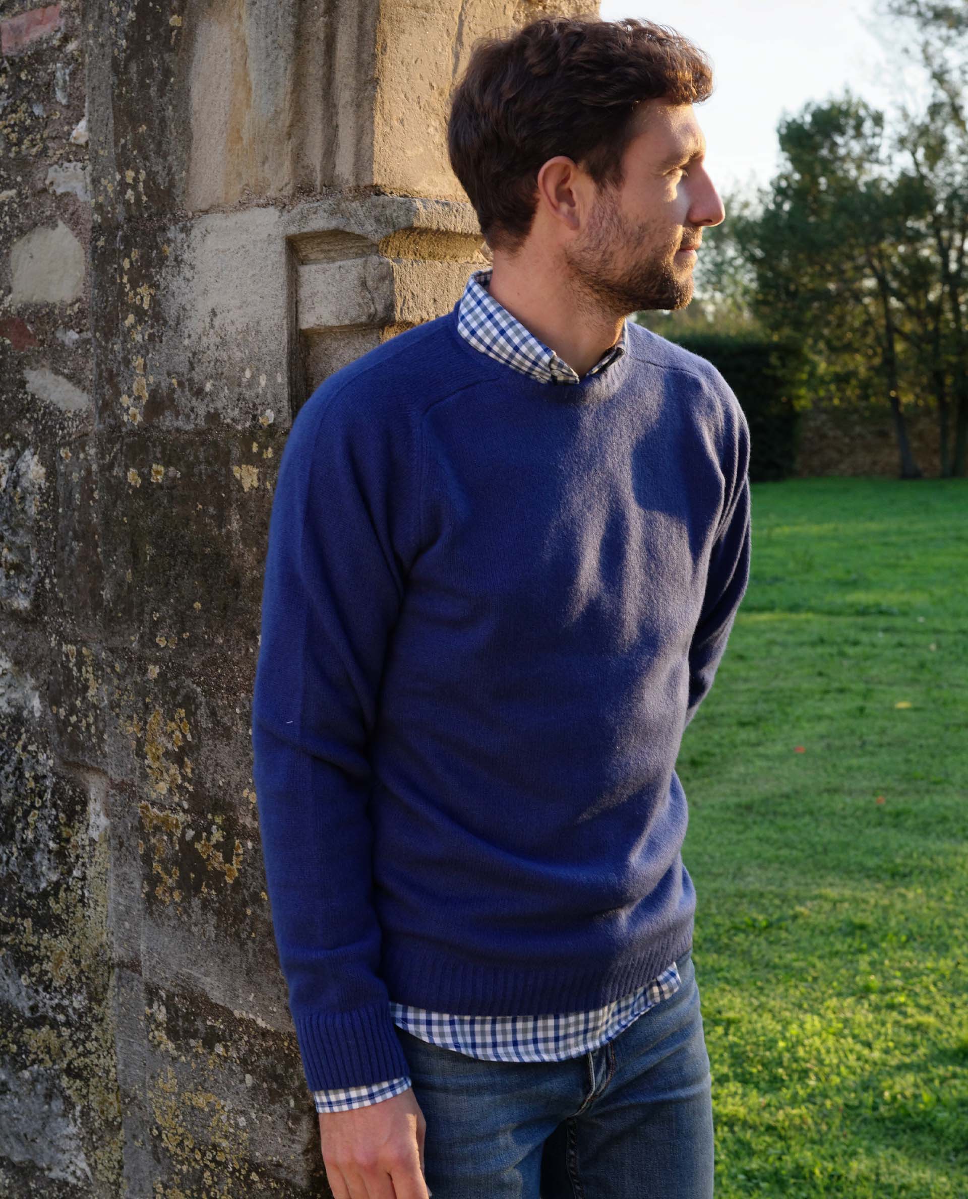 Pull encolure ronde. Finition bord-côtes. Laine 90 mérinos/10 cachemire.