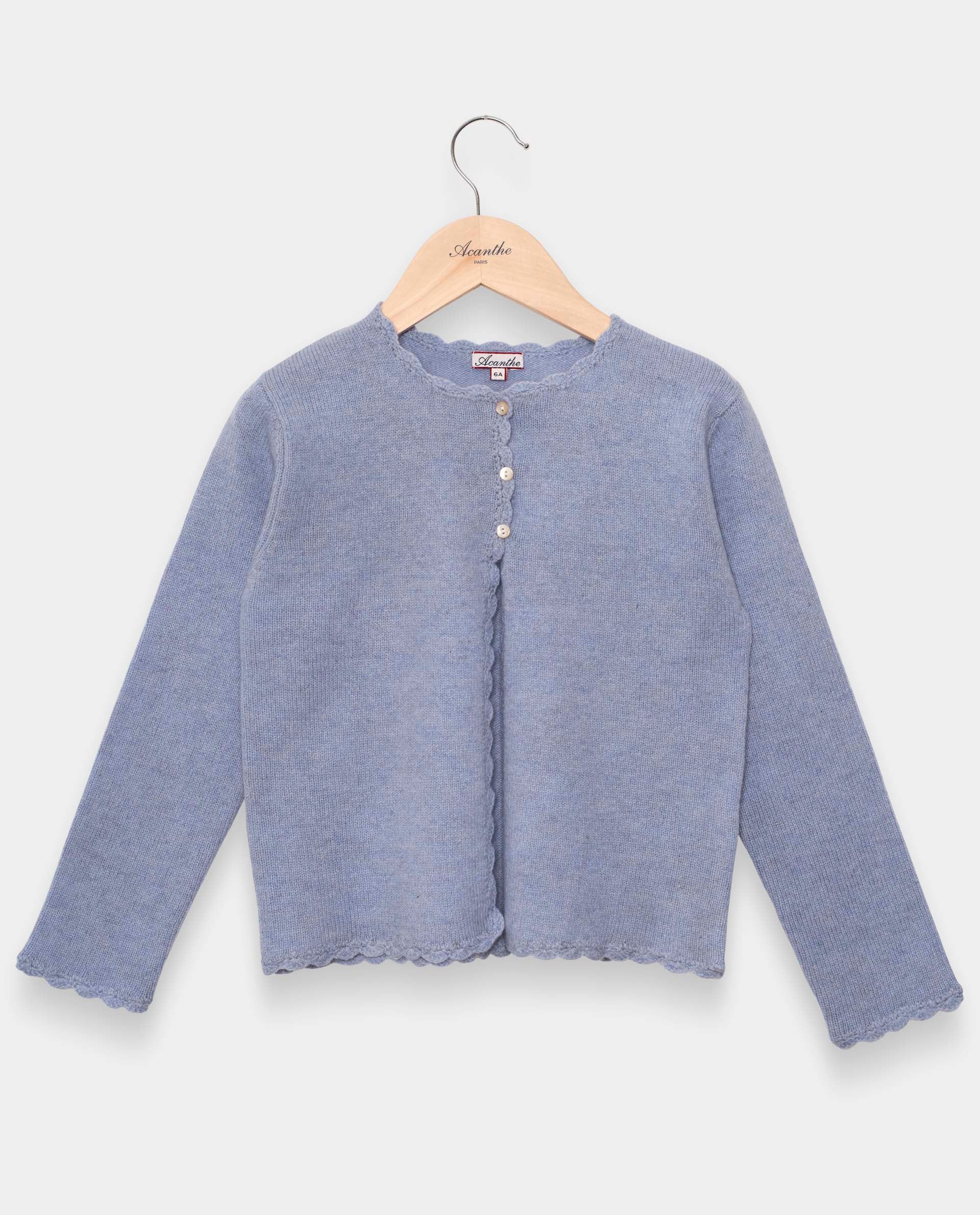 Cardigan en maille jersey finitions crochet. Fermé par 3 petits boutons nacre milieu devant. Pure laine d'agneau.