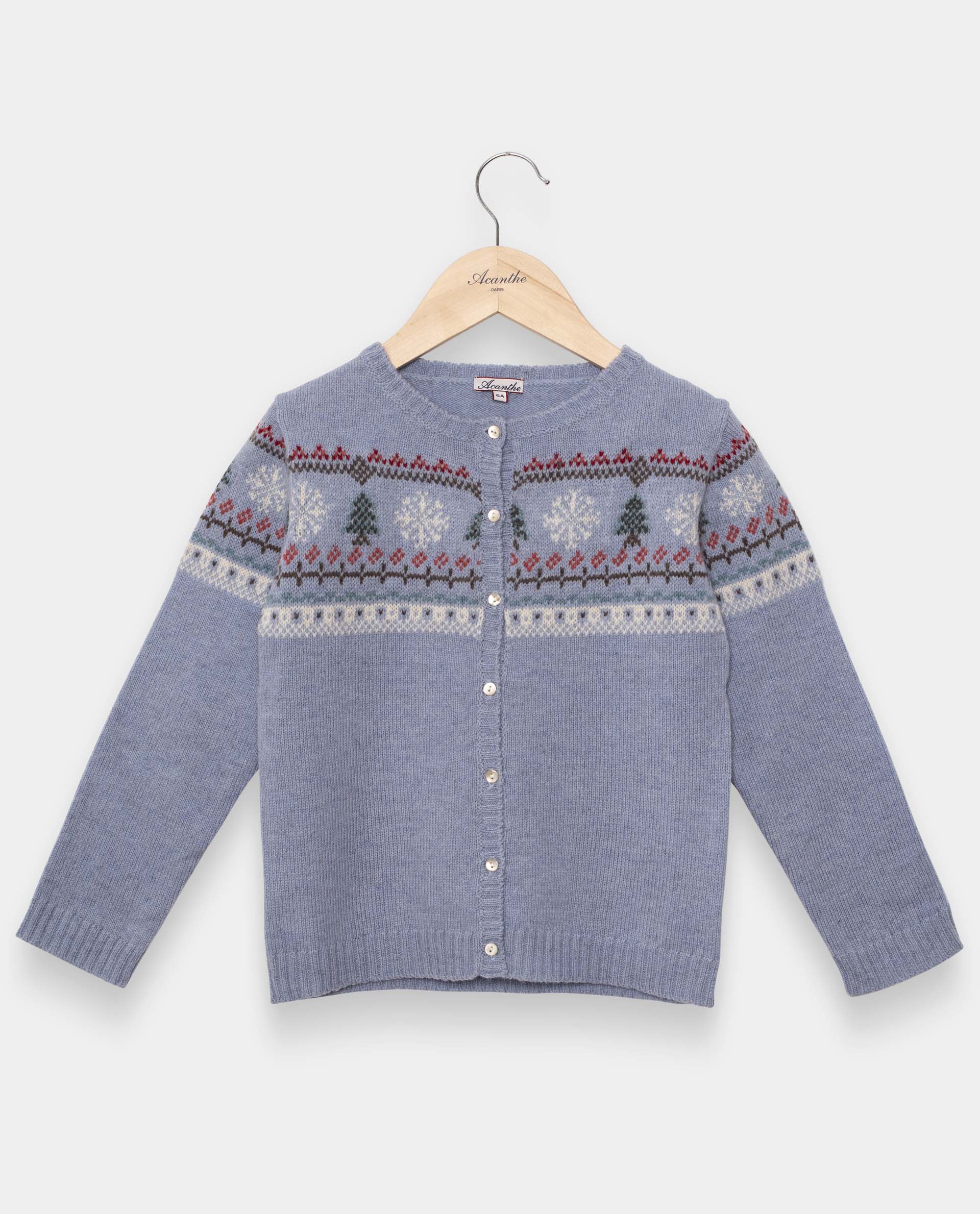 Cardigan jacquard. Fermé par des petits boutons nacre milieu devant. Finition bord-côtes. Pure laine d'agneau.