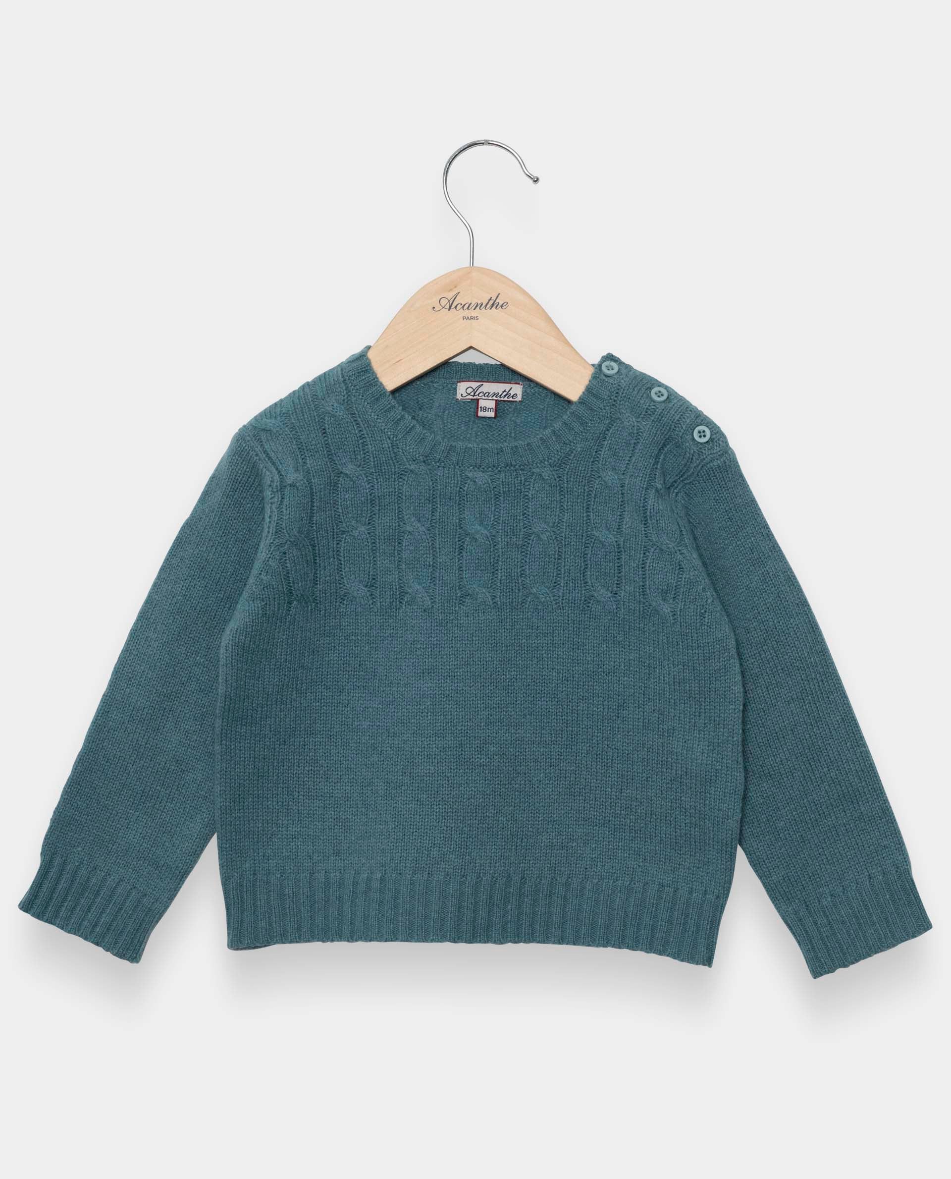Pull col rond avec torsades aux épaules devant et dos. Pure laine d'agneau.