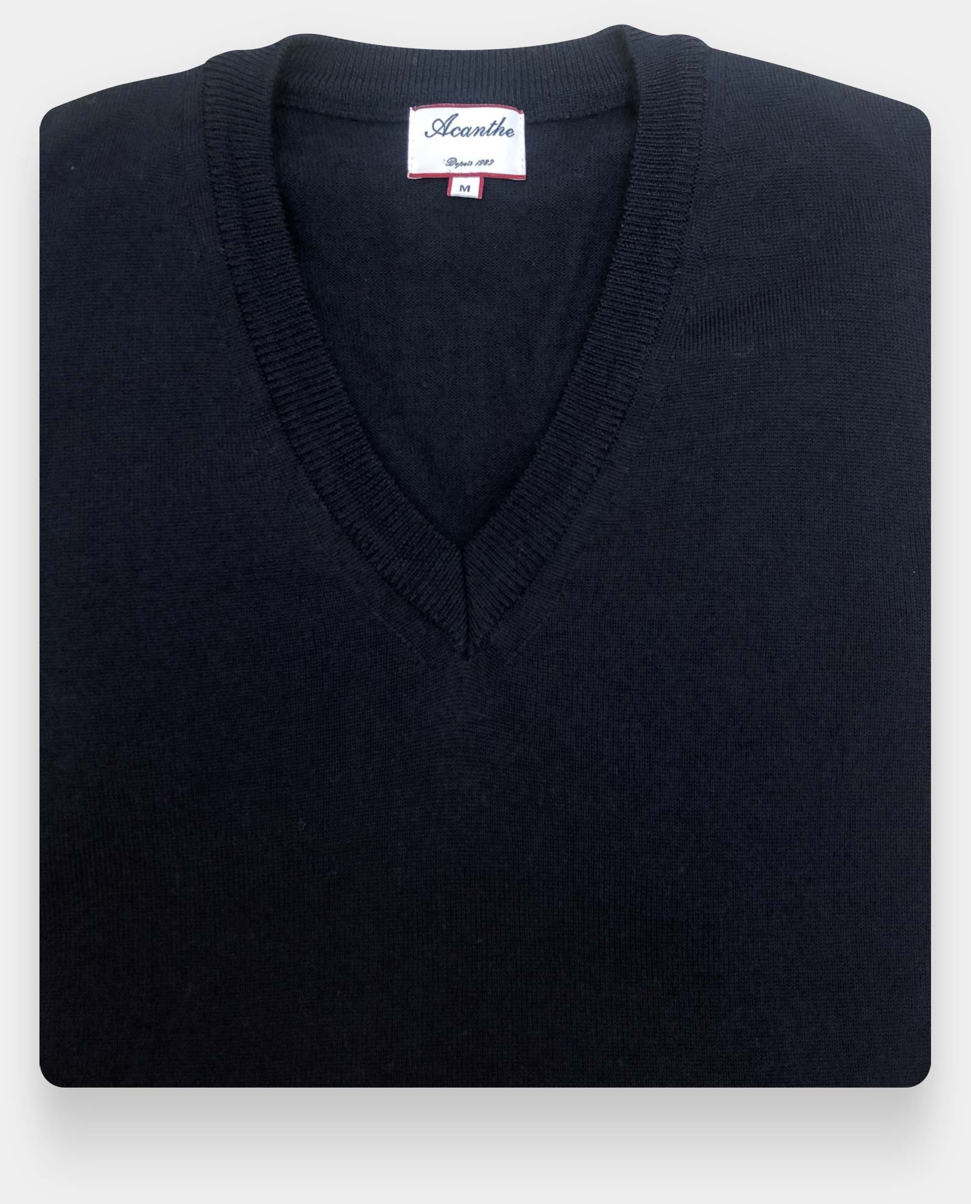 Pull col V classique. Finition bord-côtes. Laine mérinos