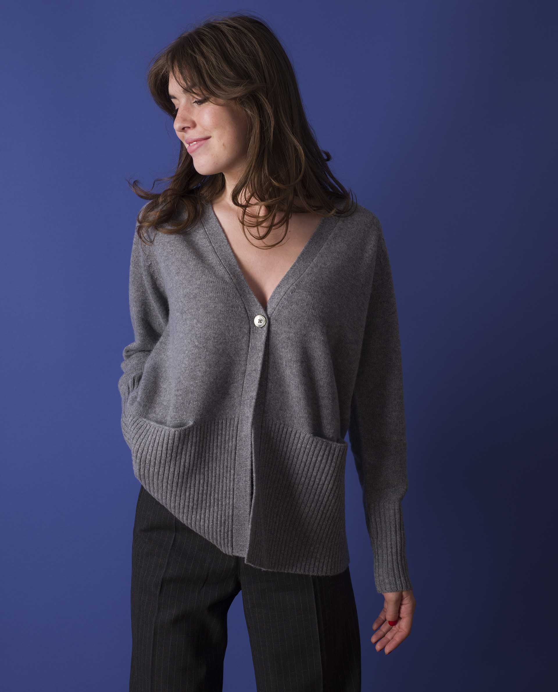 Cardigan long 1 bouton en cachemire double fil. Deux poches au devant à l'intérieur d'un large bord-côtes.