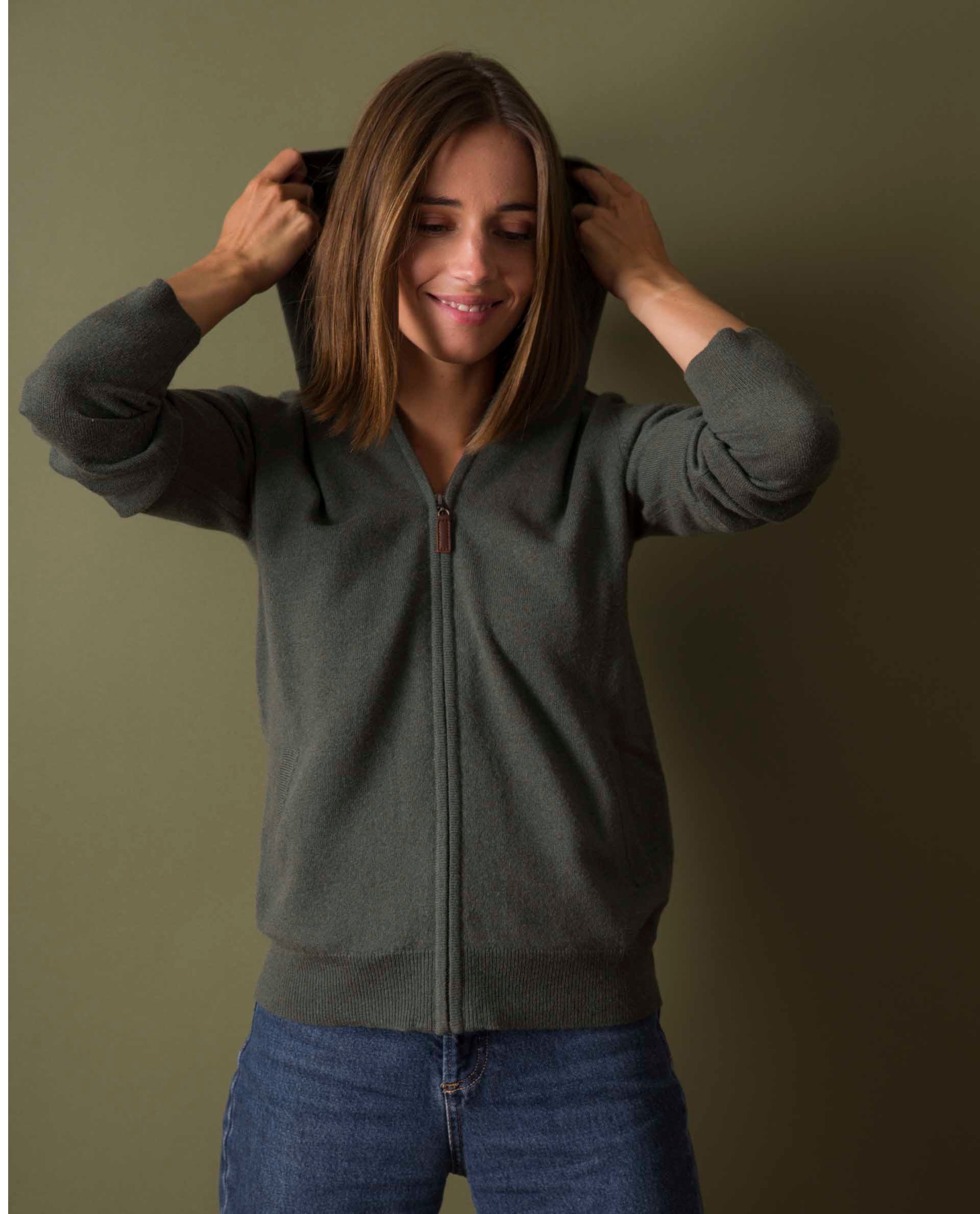 pull à capuche 100 cachemire Kaki
