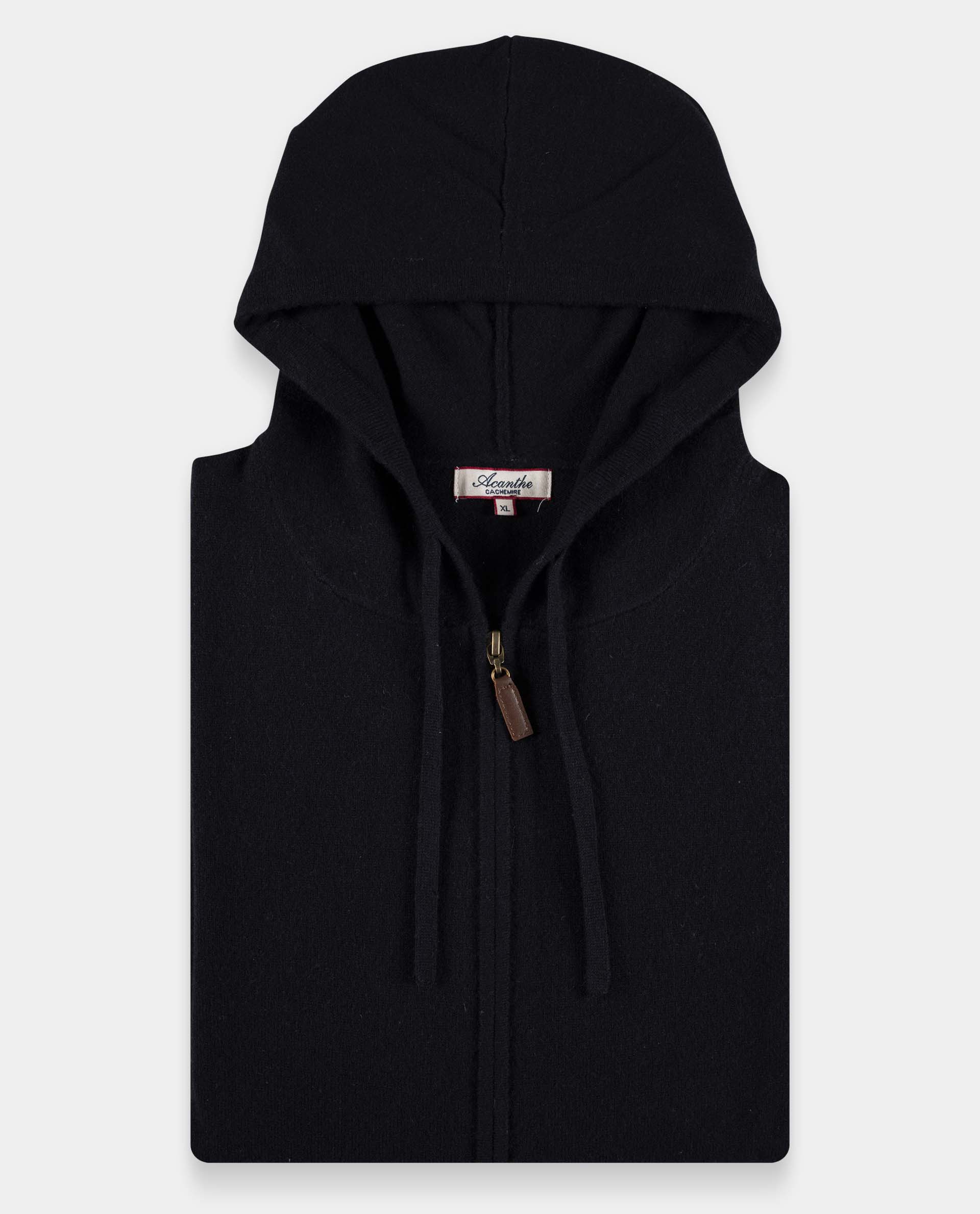 Pull zippé à capuche. Deux poches devant. Finition bord-côtes.