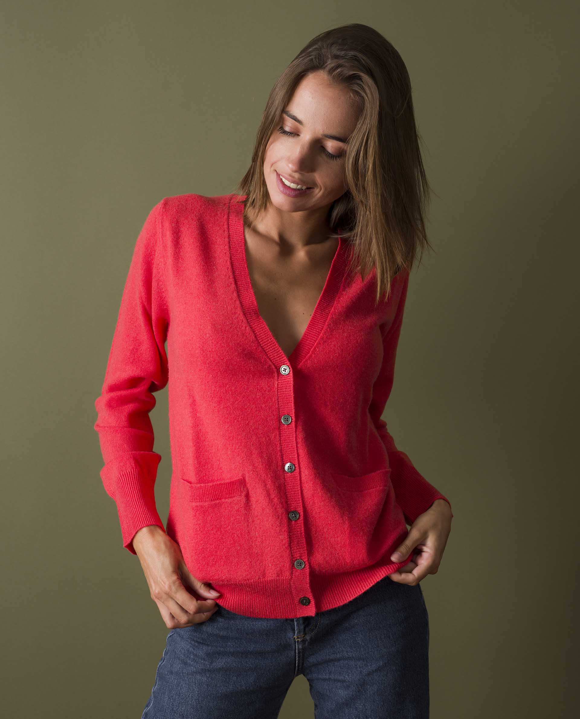 Cardigan V. Deux poches. Finition bord-côtes. Laine 70 mérinos/30 cachemire.