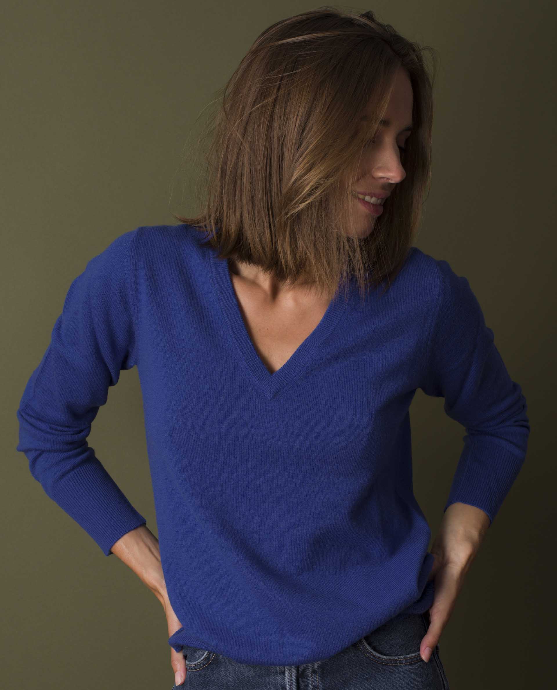Pull col V. Finition bord-côtes. Laine 70 mérinos/30 cachemire.
