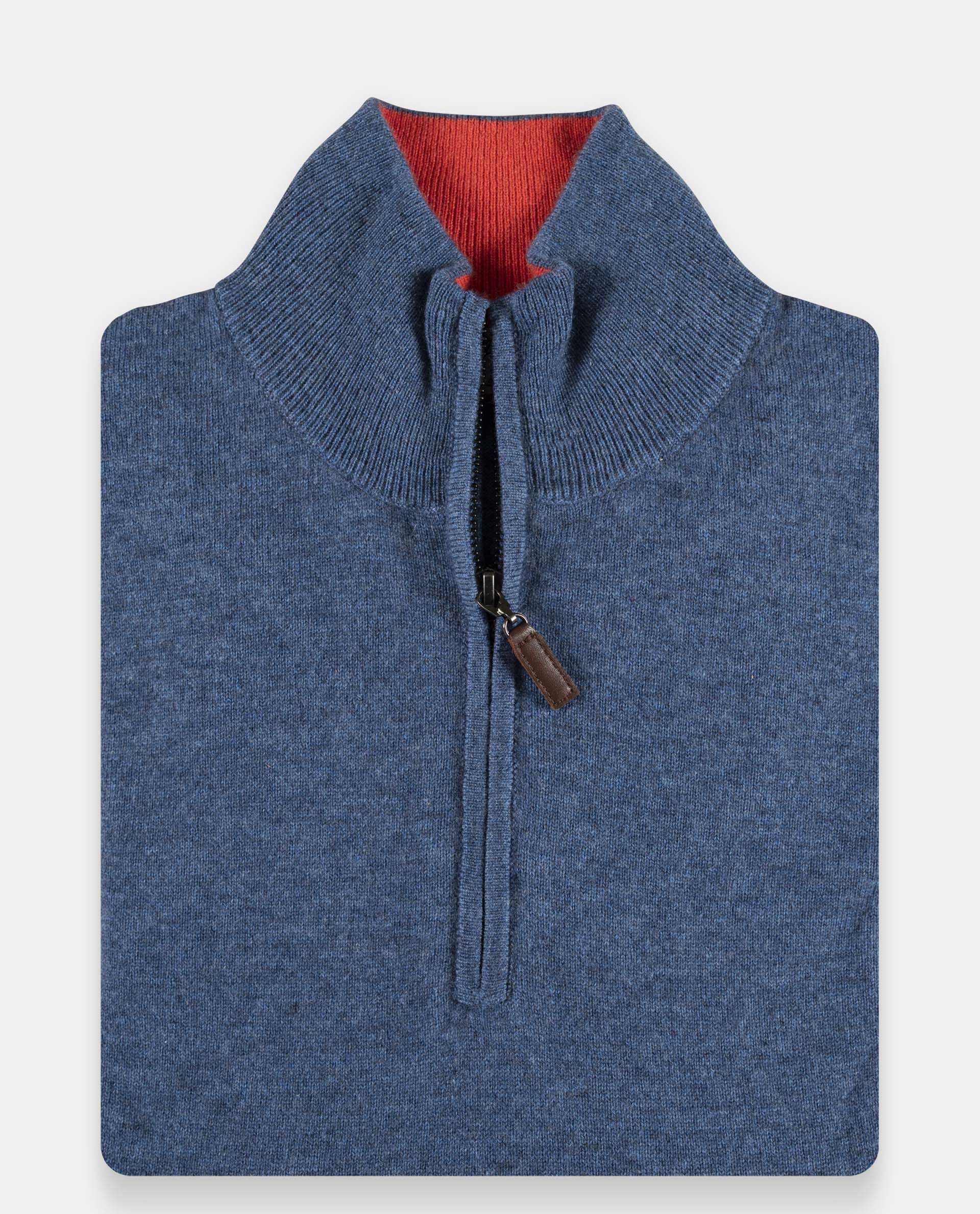 Pull col zippé. Finition bord-côtes. Laine 70 mérinos/30 cachemire.
