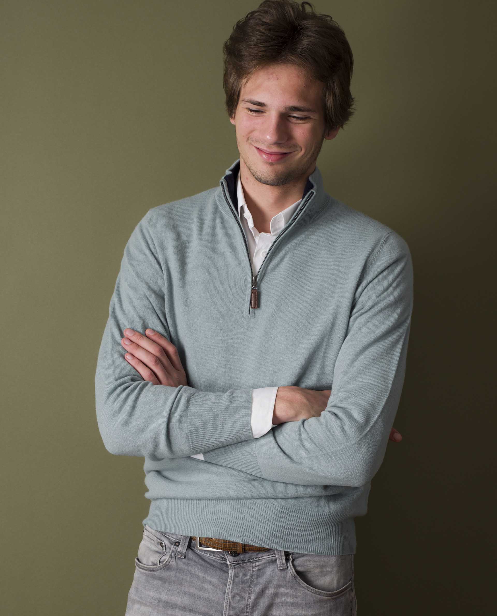 Pull col zippé. Finition bord-côtes. Laine 70 mérinos/30 cachemire.