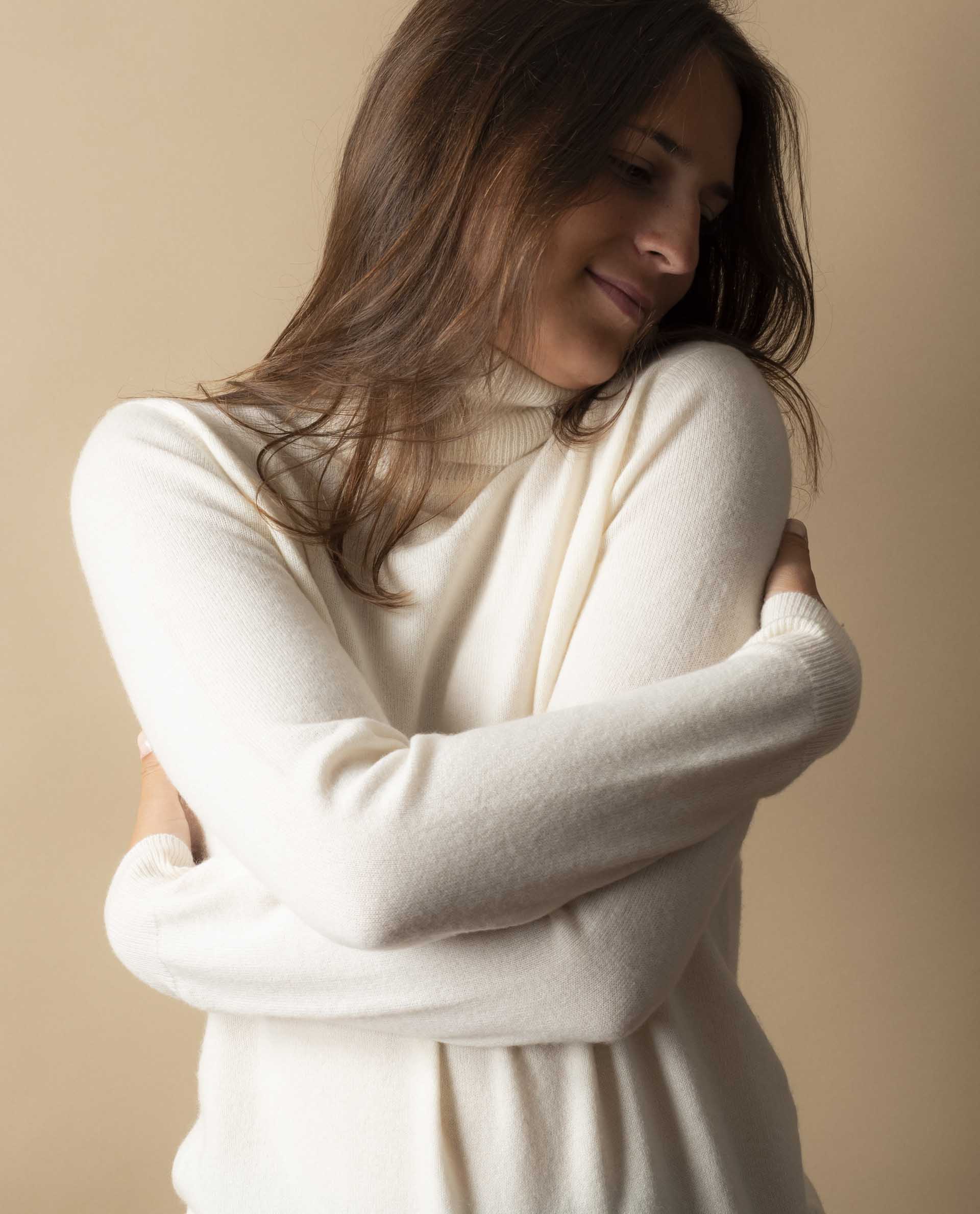 Pull col roulé classique en cachemire double fil. Finition bord côtes.