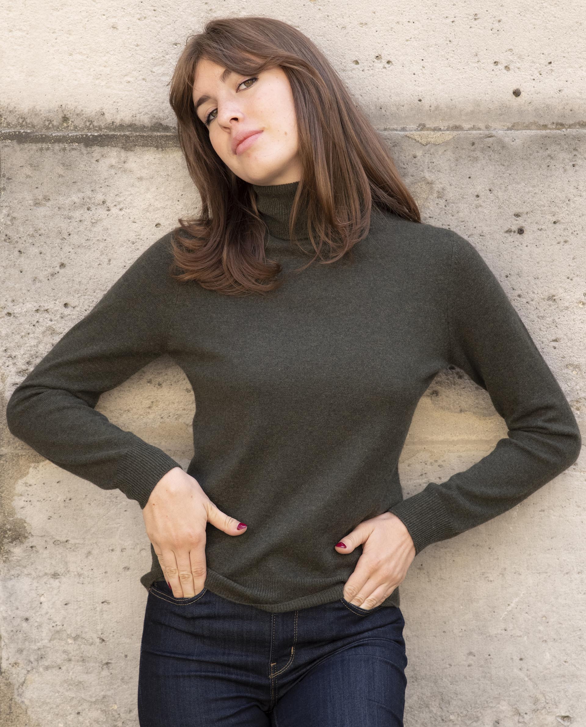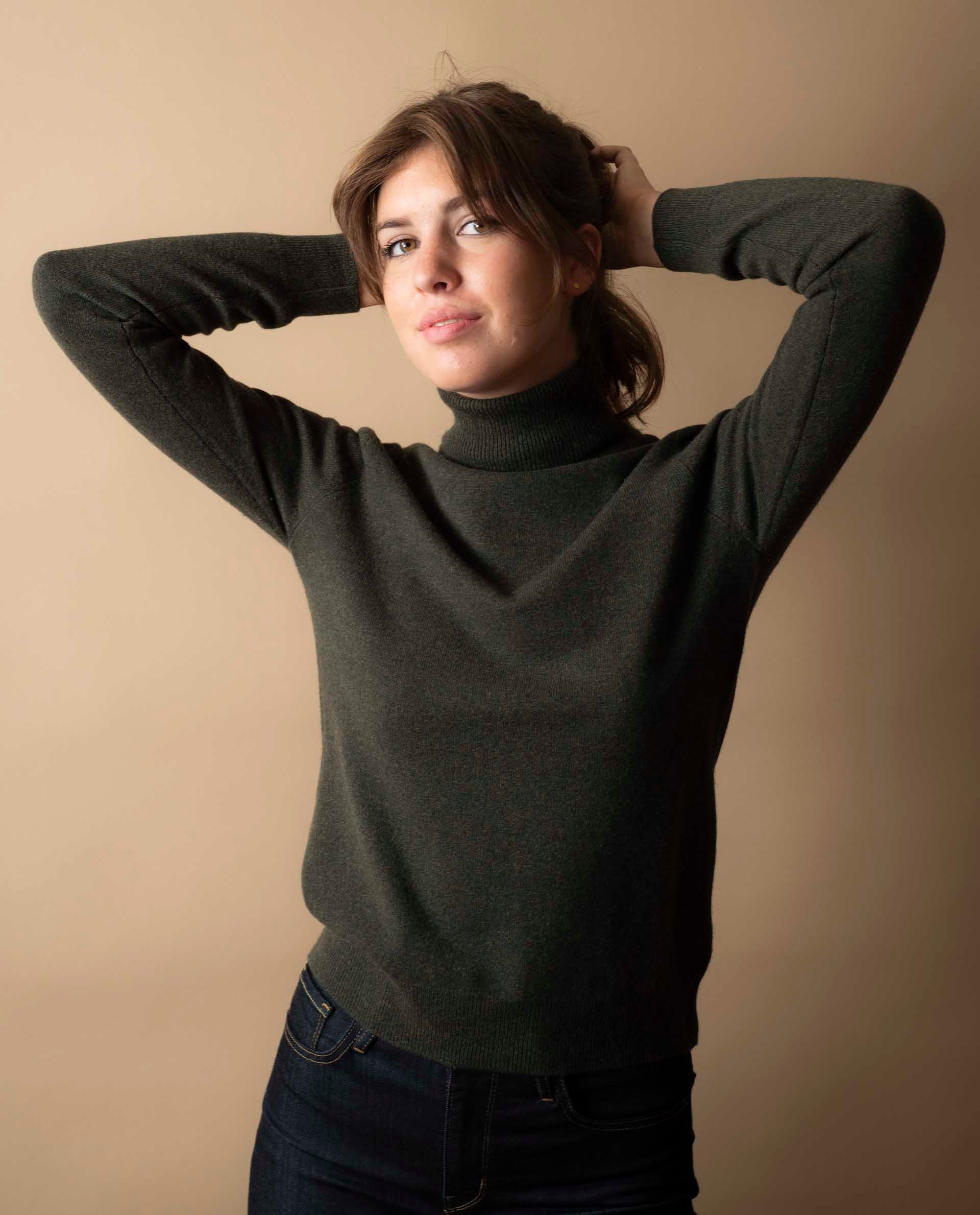 Pull col roulé classique en cachemire double fil. Finition bord côtes.