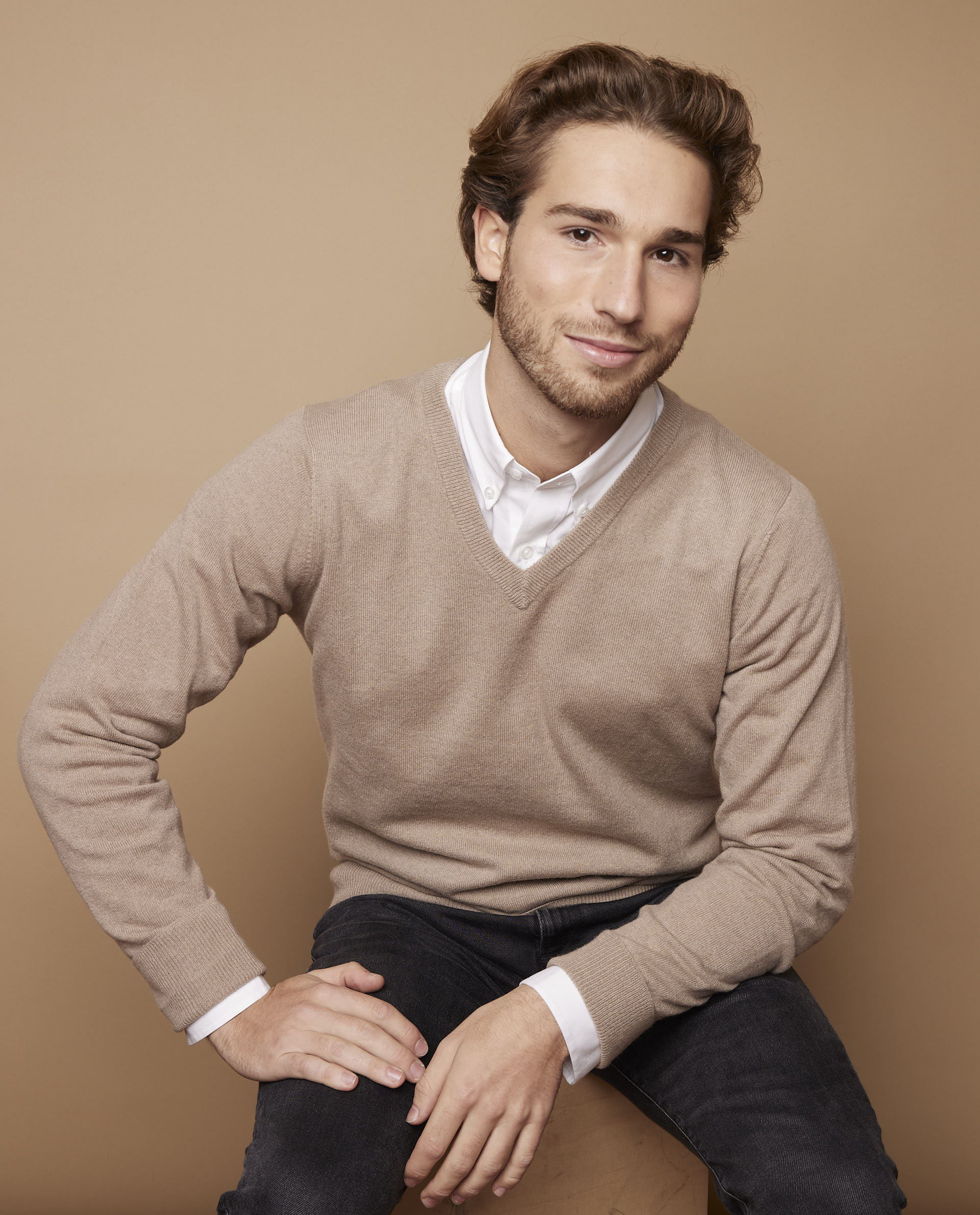 Pull maille jersey en cachemire double fil. Encolure V. Finition bord côtes.