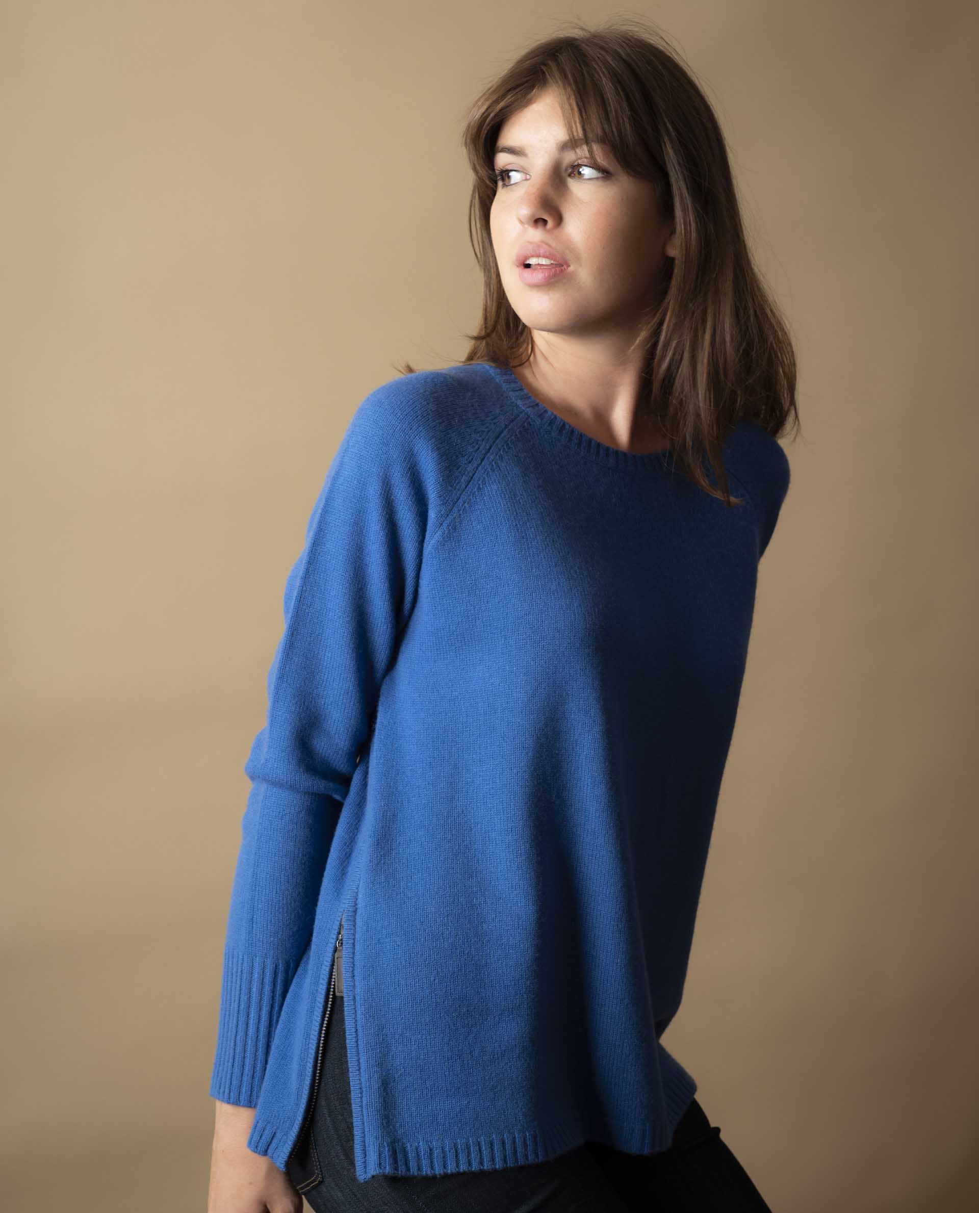 Large pull encolure ronde. Fente zippée de chaque côté. Finition bord-côtes.