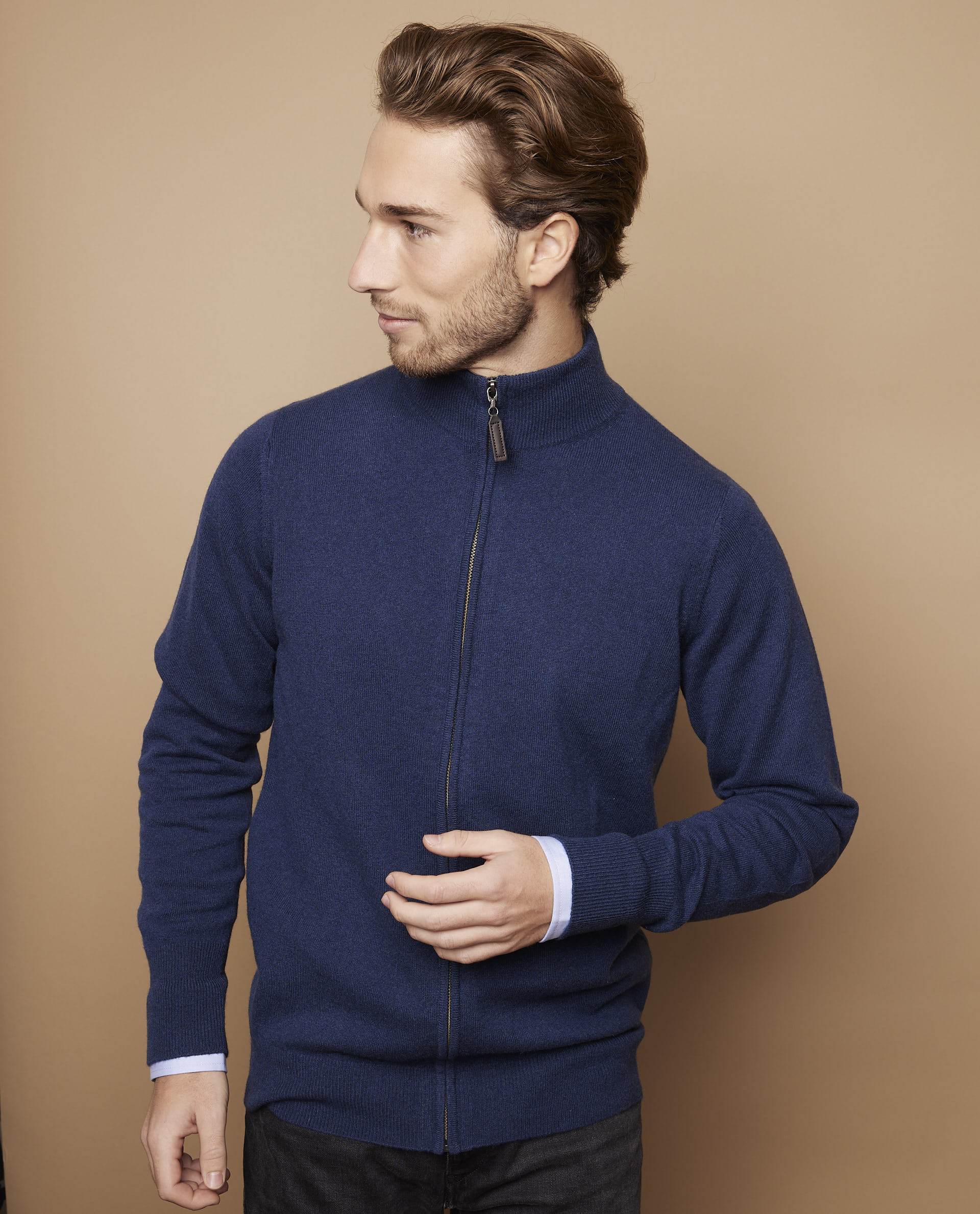 Cardigan zippé en cachemire double fil. Col montant avec intérieur contrasté. Finition bord côtés.