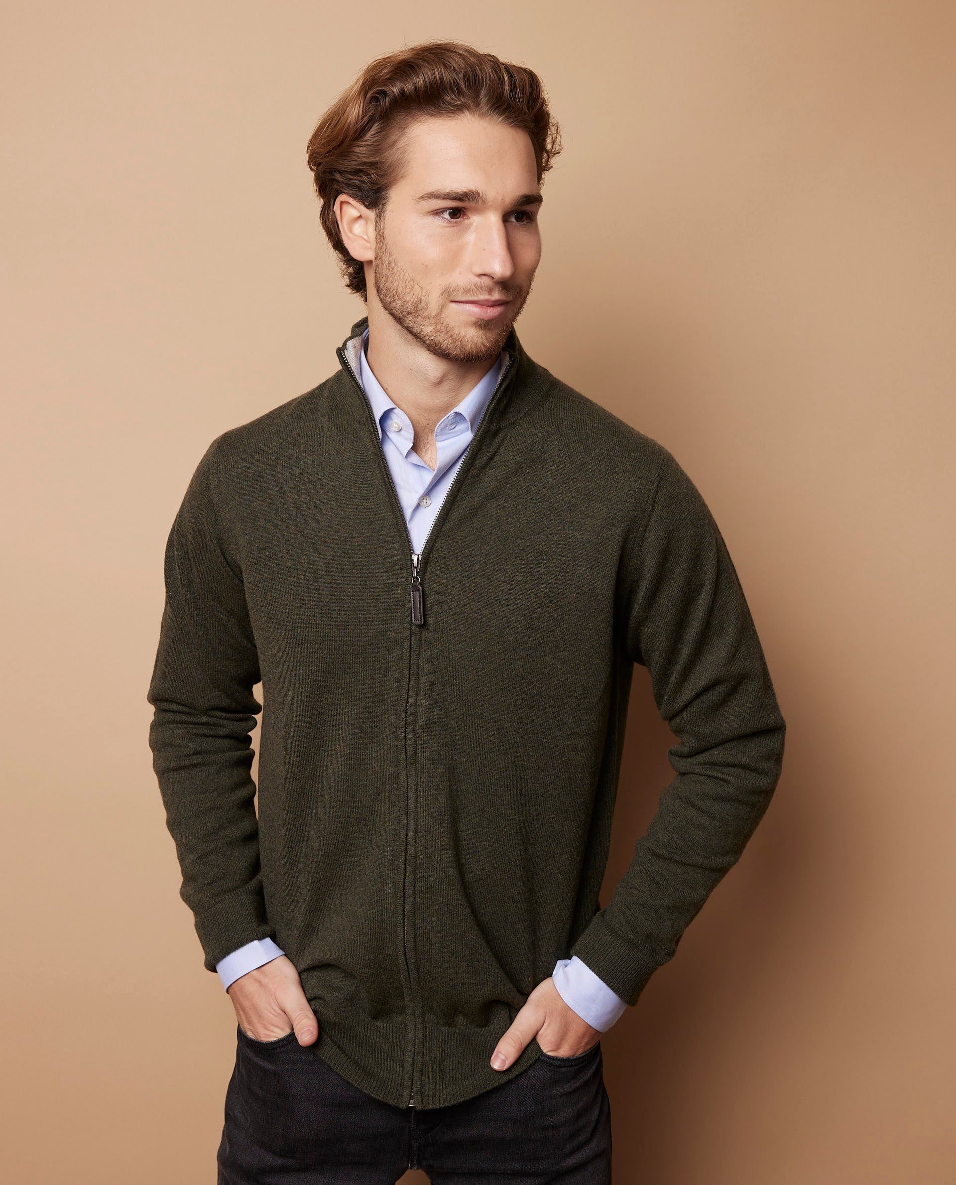 Cardigan zippé en cachemire double fil. Col montant avec intérieur contrasté. Finition bord côtés.