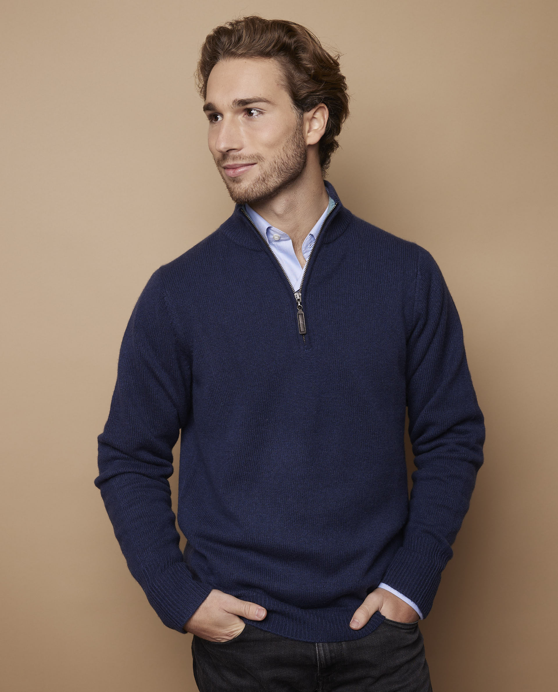Pull maille jersey en cachemire double fil. Maille plus lourde que sur notre pull zippé classique. Col zippé avec intérieur contrasté. Finition bord côtes.