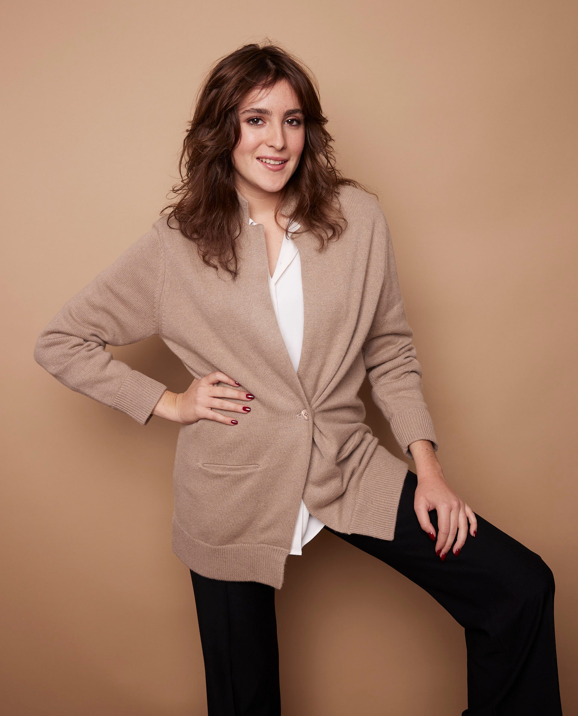 Grosse veste col tailleur. Deux poches intérieures. Fermeture droite ou croisée. Finition bord-côtes double.