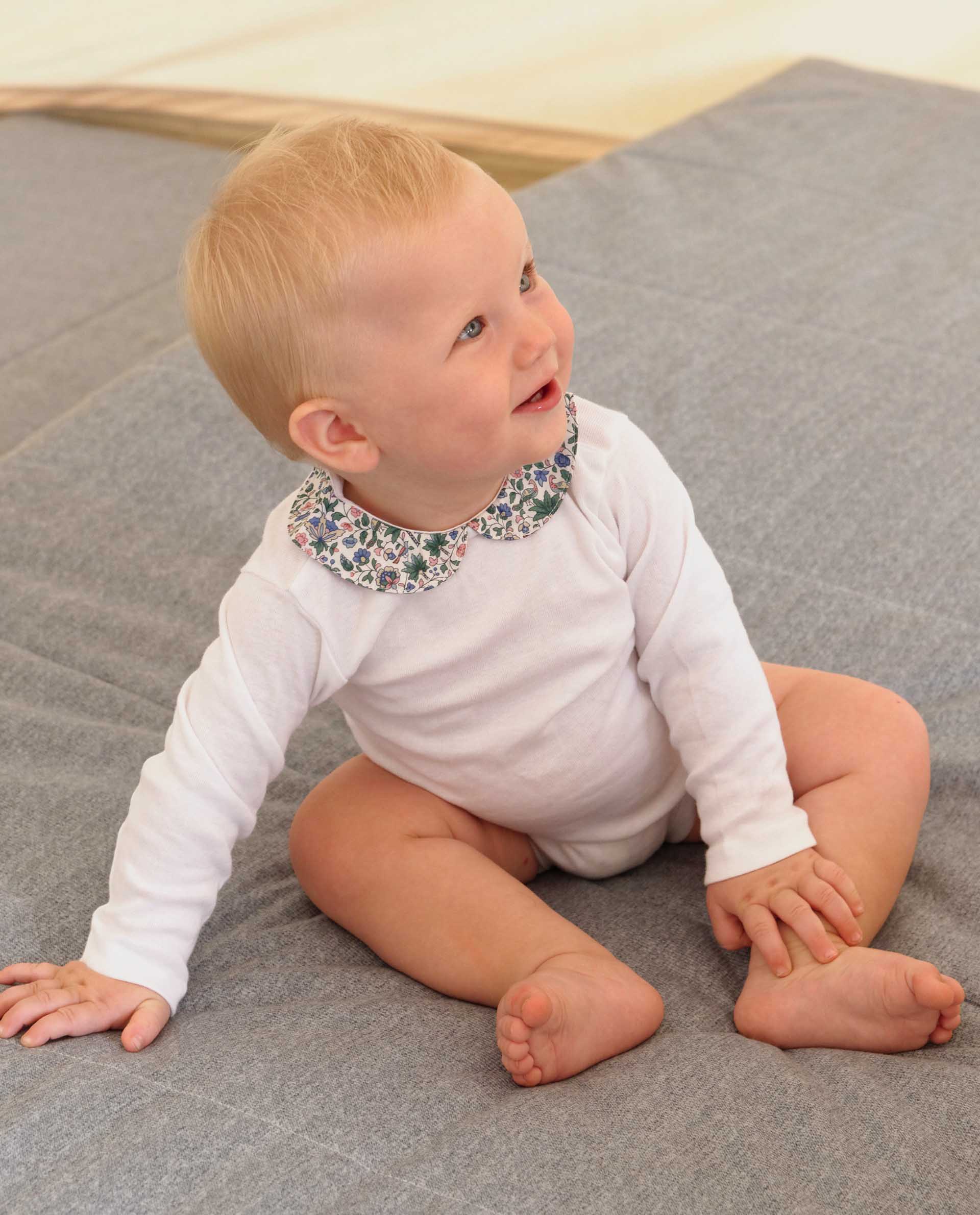 Body manches longues en pur coton. Patte boutonnée au dos. Entrejambe pressionné. Petit col claudine en tissu Liberty