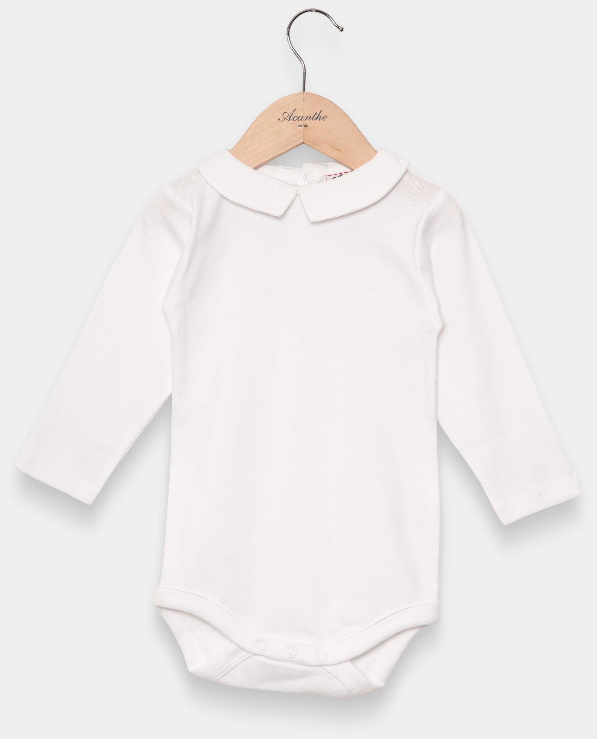 Body manches longues en pur coton. Patte boutonnée au dos. Entrejambe pressionné. Petit col carré en popeline