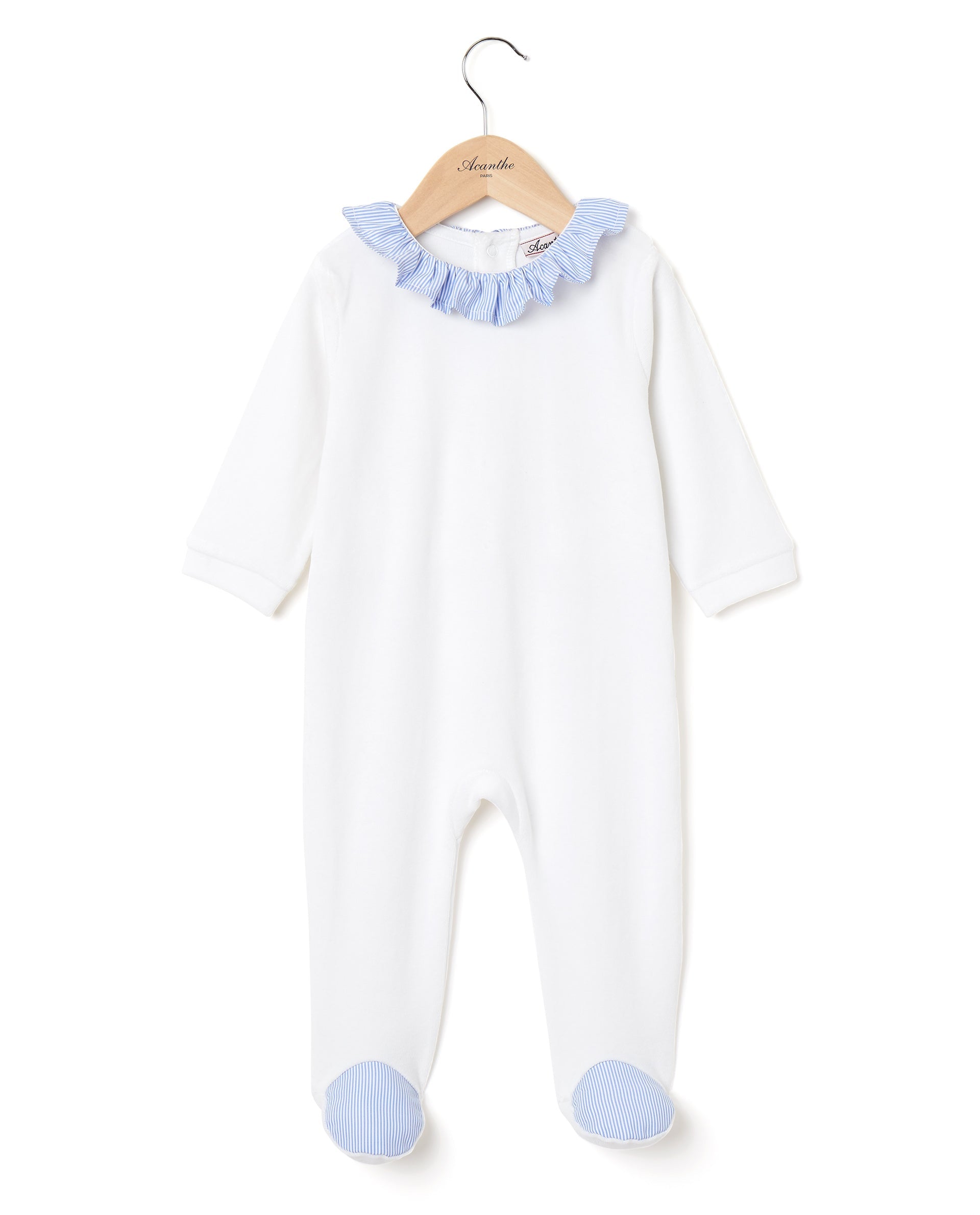 Pyjama bébé en velours éponge. Petit col volanté et dessus des pieds en popeline. Ouverture dos pont pressionné