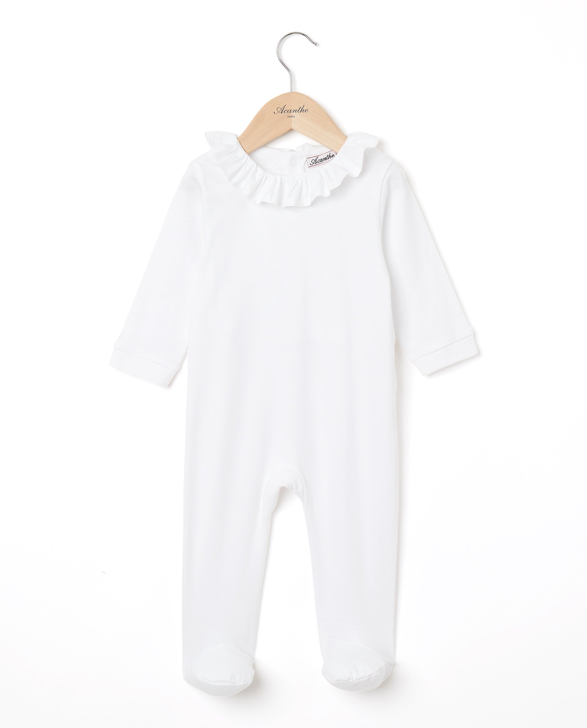 Pyjama bébé en velours éponge. Petit col volanté en popeline. Ouverture dos pont pressionné