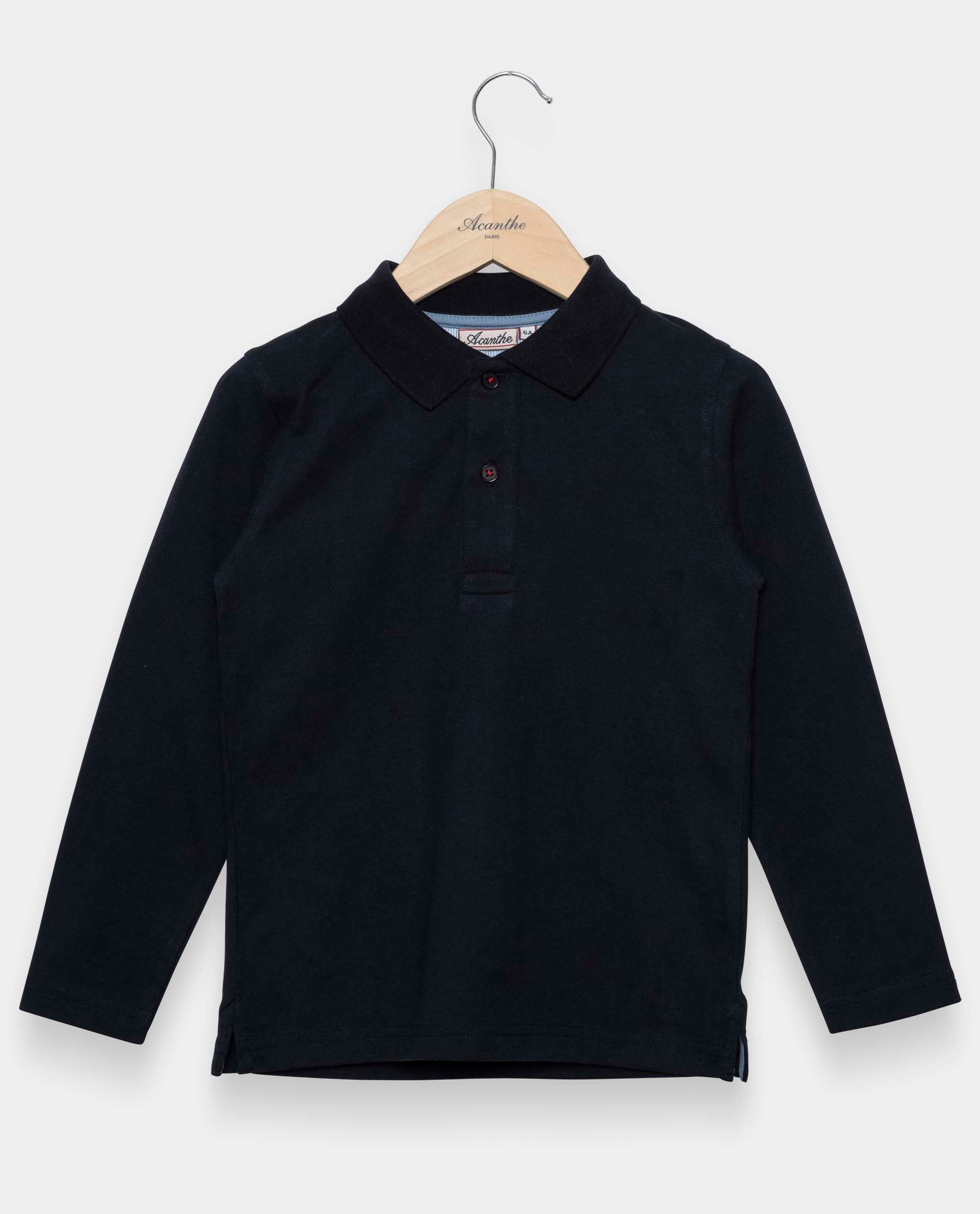 Polo en maille jersey pur coton. Manches longues. Col polo en côtes. Empiècement à l'intérieur sous l'encolure en popeline rayée. Fentes aux côtés
