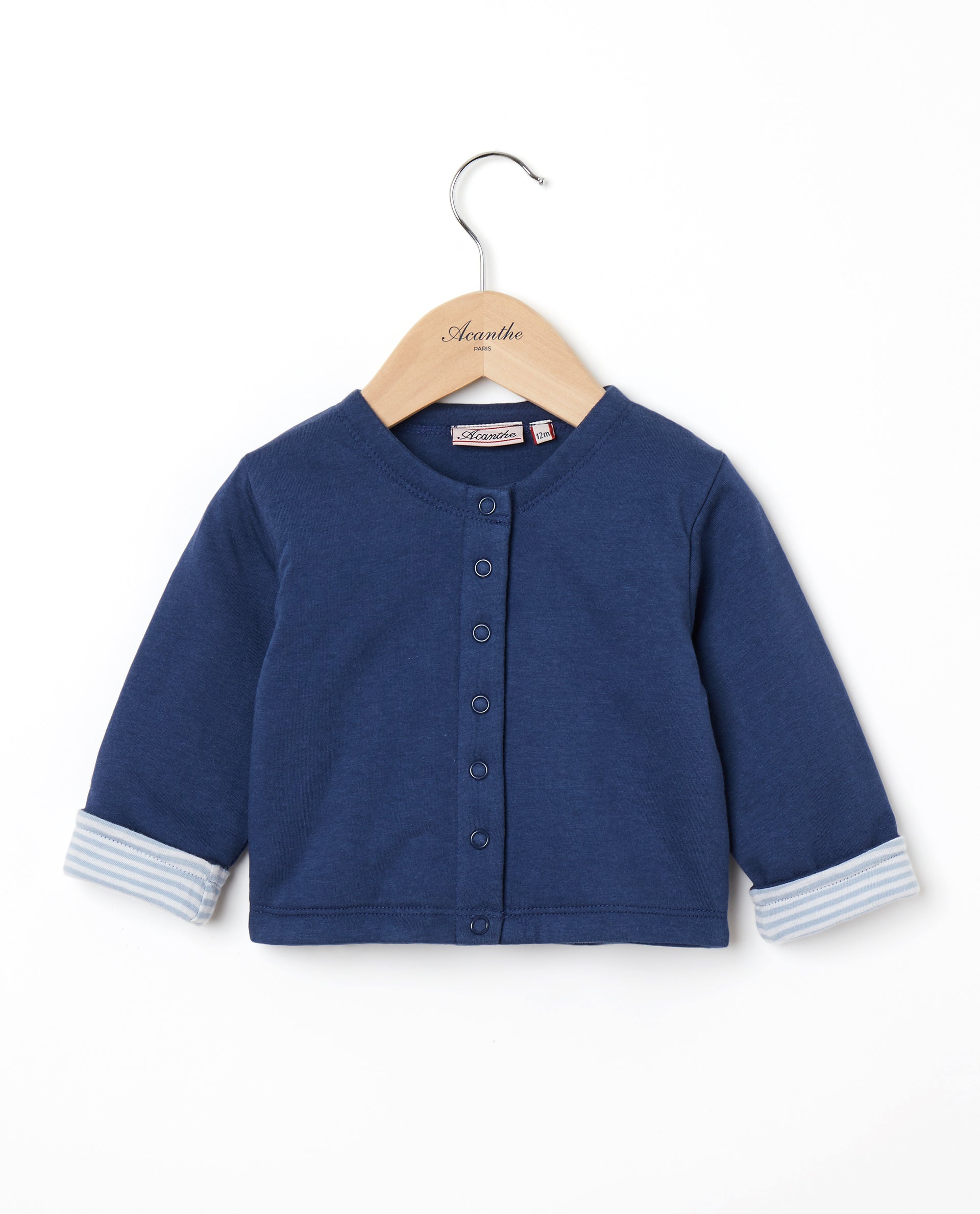 Boutons pression au milieu devant. Doublure rayée au bas de manche