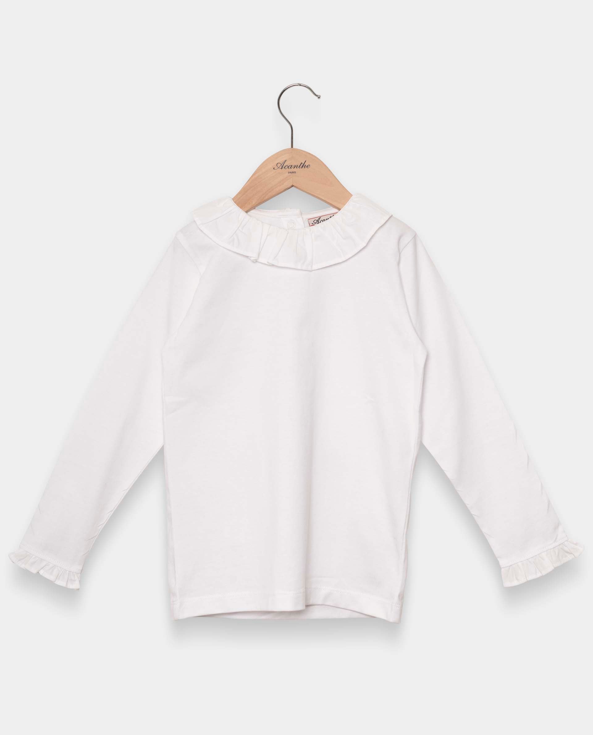 T-shirt encolure ronde orné d'un petit volant en voile de coton blanc au col et au bas des manches longues. Boutonné au dos. Maille jersey coton