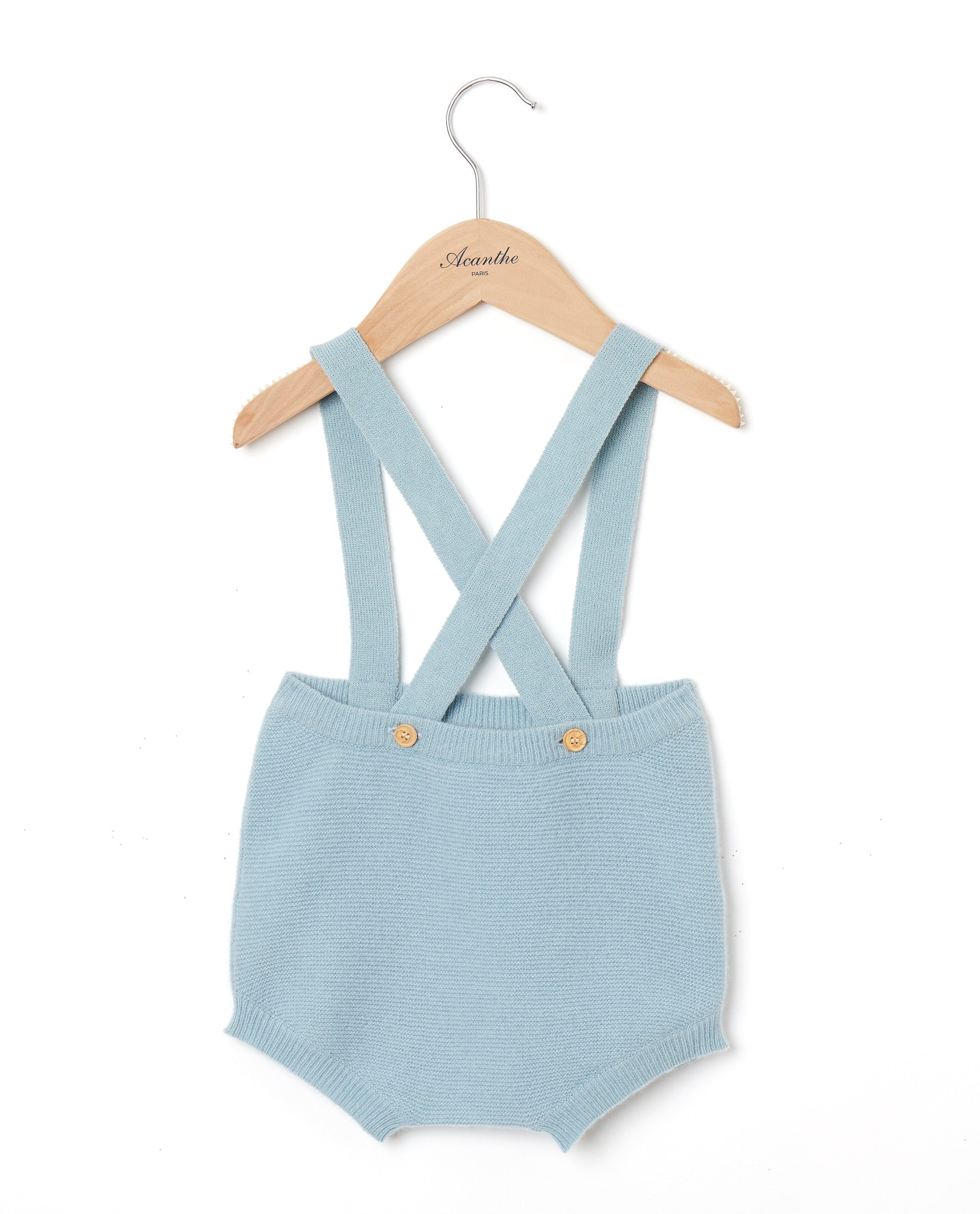 Culotte bébé point mousse en laine et cachemire. Bretelles boutonnées dans la ceinture. Boutons en bois.