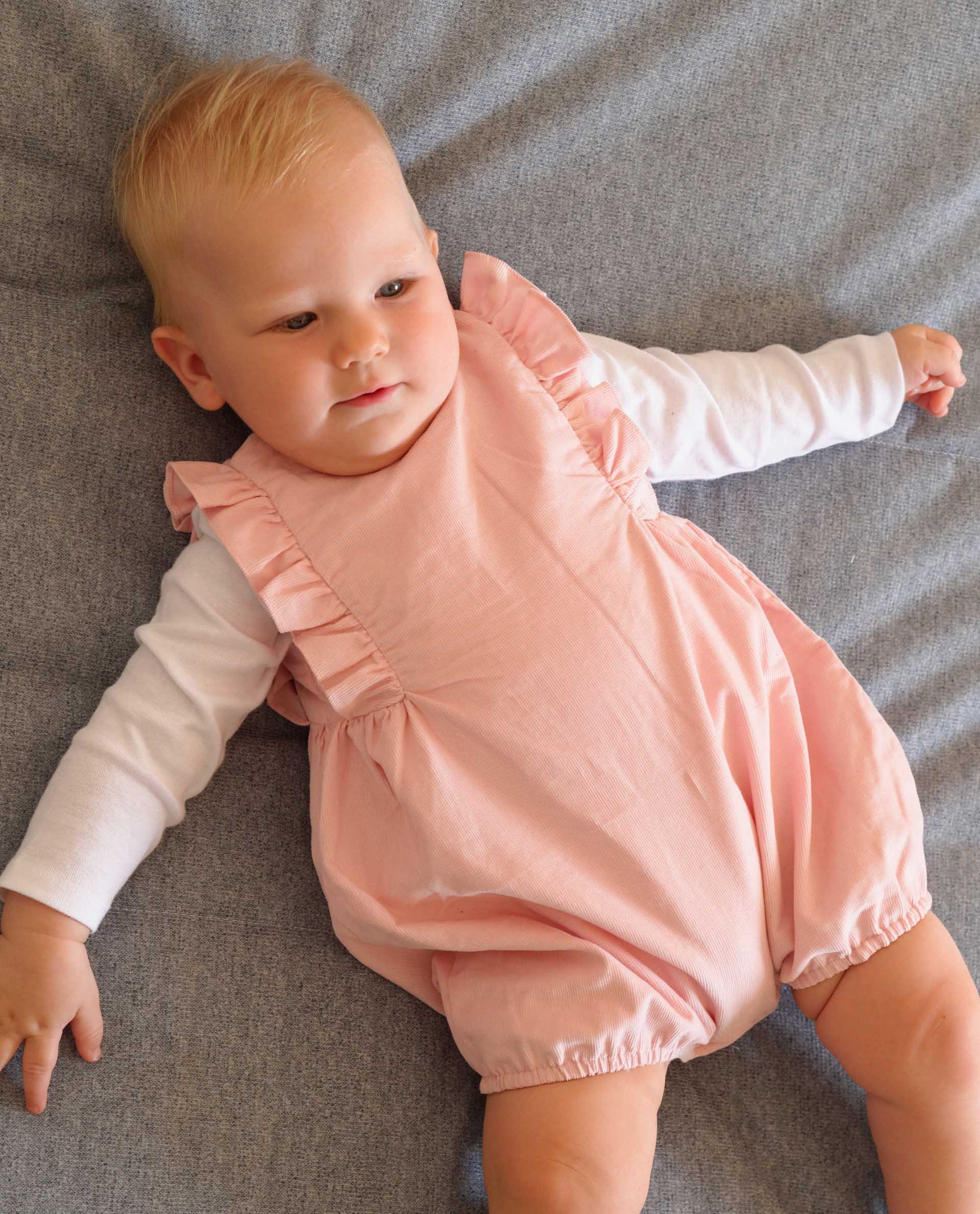 Barboteuse sans manche entièrement doublée. Volants de chaque côté. Boutonnée au dos. Boutons pression à l'entrejambe. Pur coton