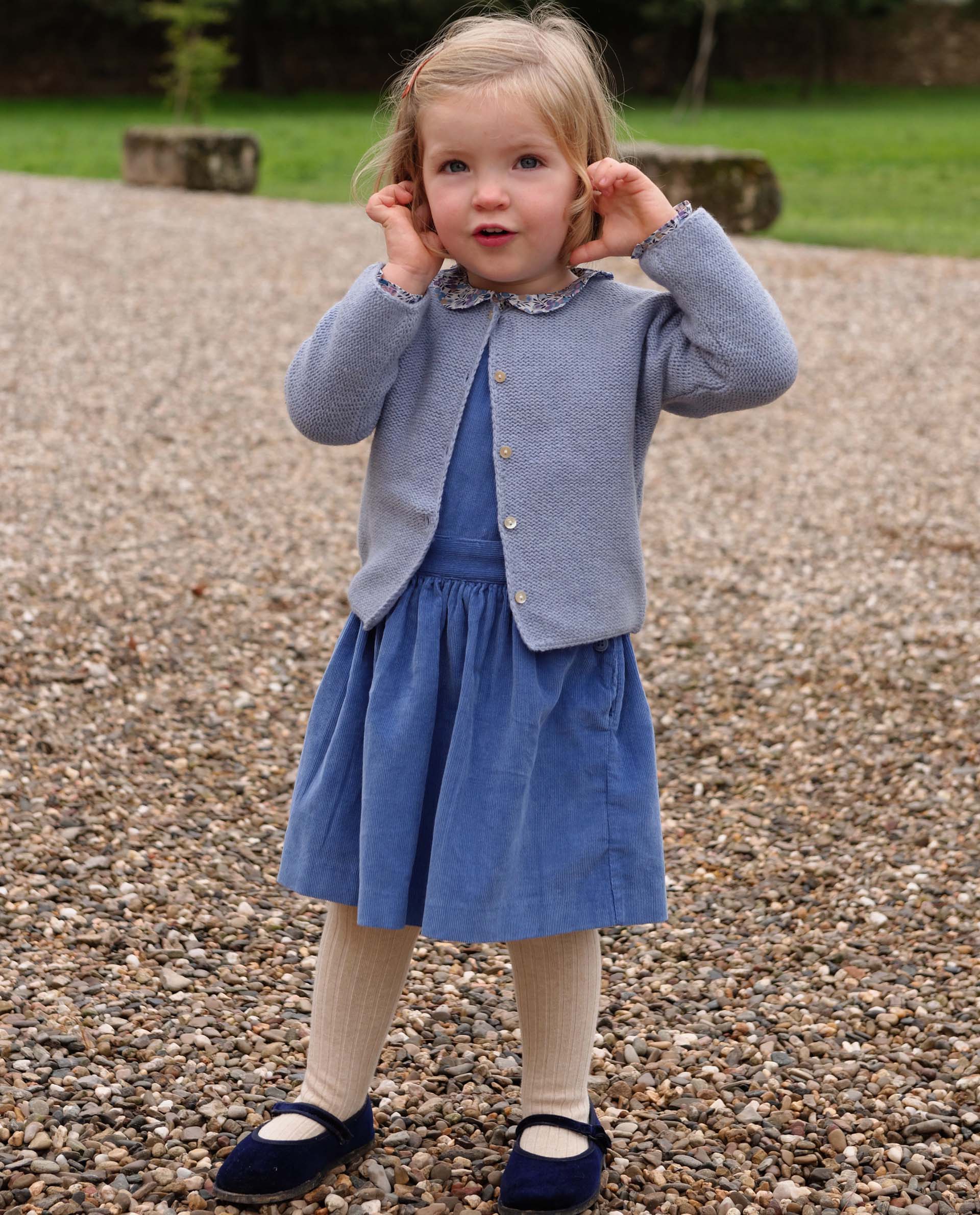 Robe sans manches en velours. Buste doublé. Bretelles boutonnées. Encolure ronde devant et dos. Pur coton