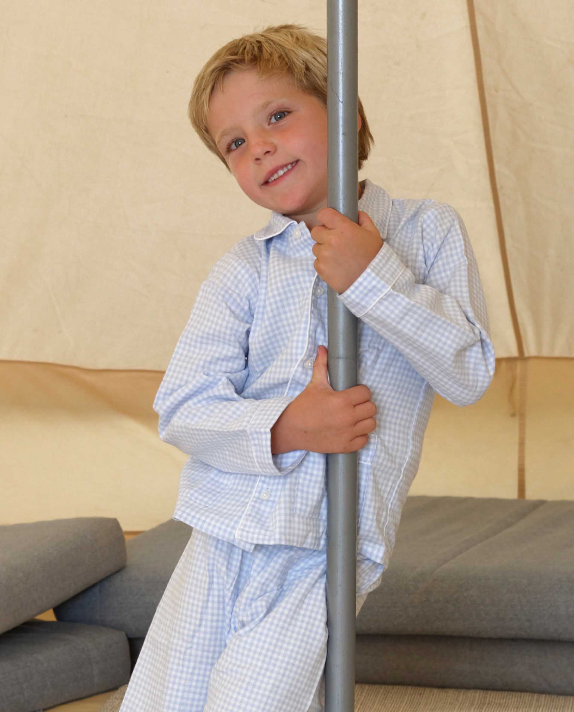 Pyjama garçon classique. Veste boutonnée devant, col pointu, manches longues et 2 poches plaquées. Bas à taille élastiquée. Finitions passepoil