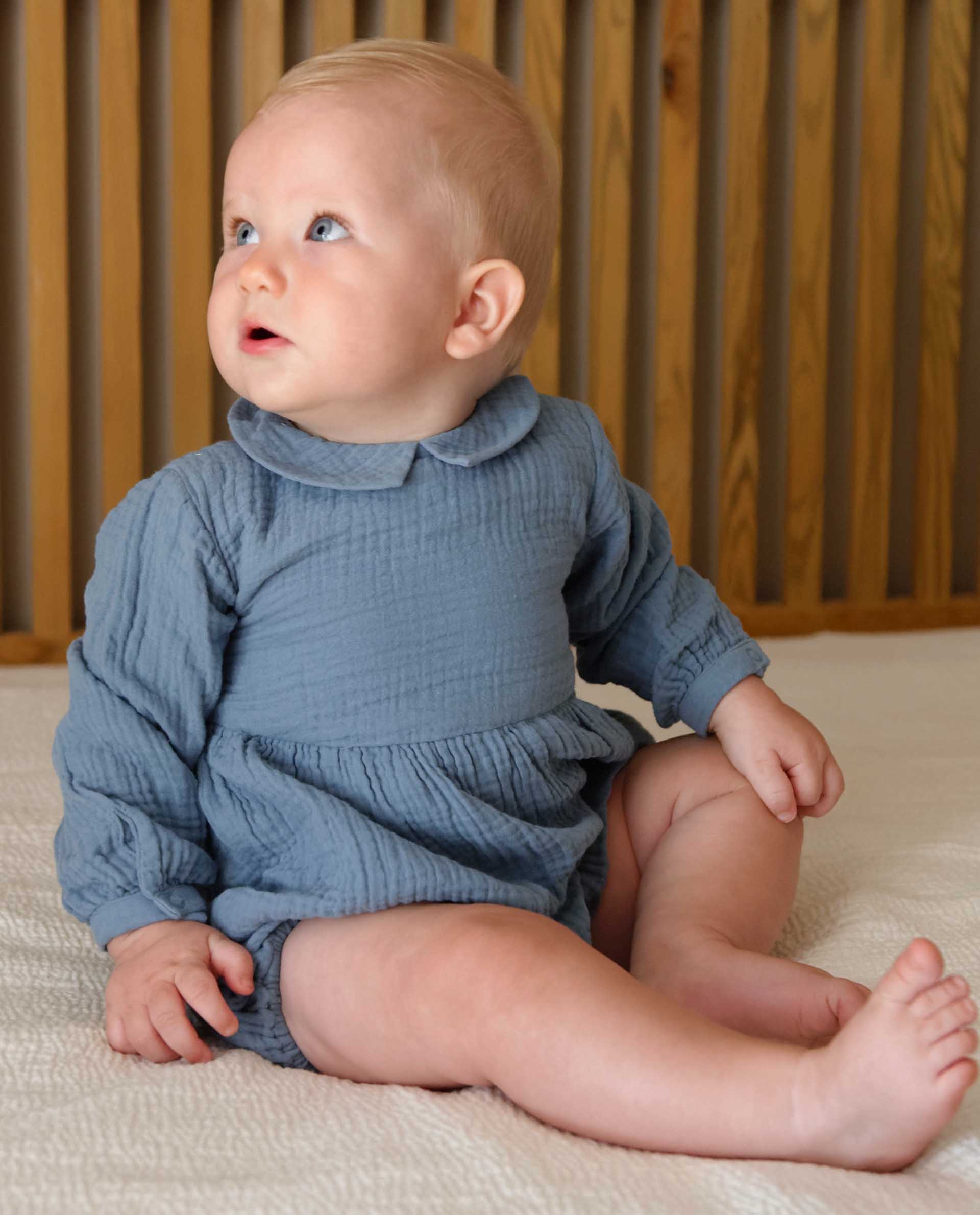 Barboteuse en double gaze de coton. Col carré. Boutonnage dos. Manches longues resserrées par une bracelet boutonné. Boutons pression à l'entrejambe. Buste doublé