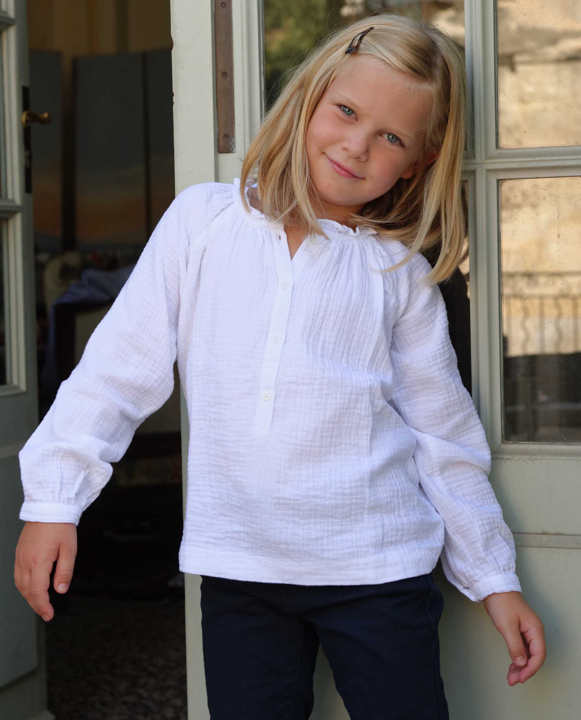 Blouse en double gaze de coton. Manches longues resserrées par un bracelet boutonné. Encolure ronde avec petit volant