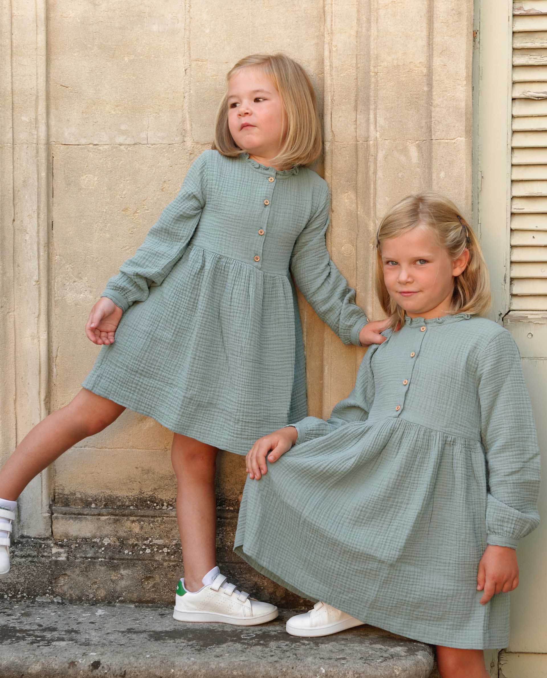 Robe en double gaze de coton. Manches longues resserrées par un bracelet boutonné. Boutons en bois sur le buste. Encolure ronde avec petit volant
