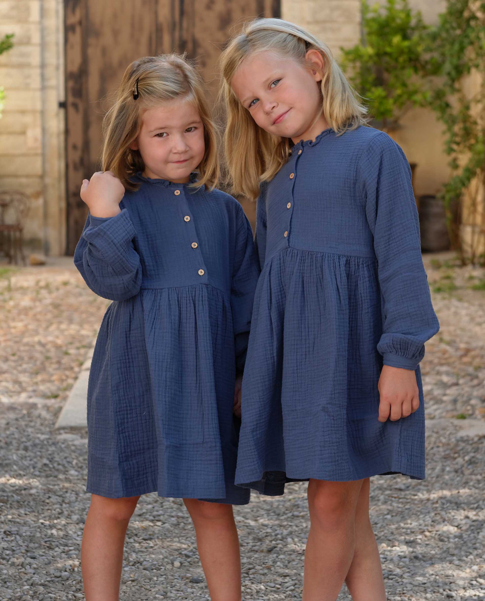 Robe en double gaze de coton. Manches longues resserrées par un bracelet boutonné. Boutons en bois sur le buste. Encolure ronde avec petit volant